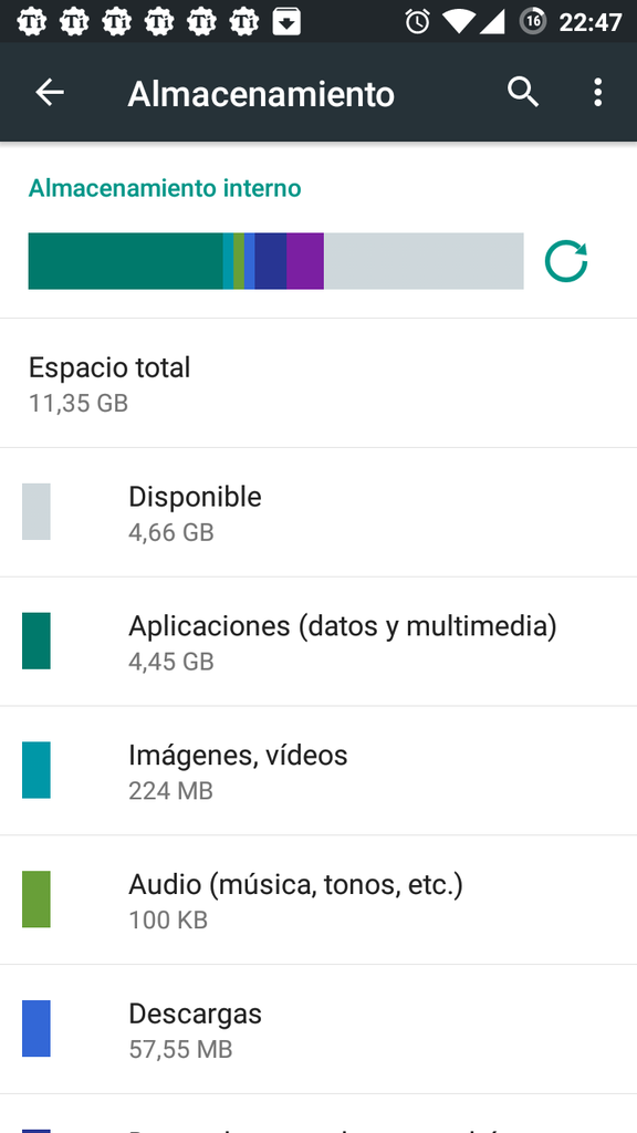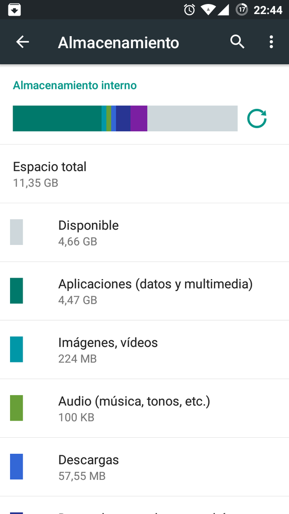 con android 5.1.1 fijarse en los 4,47 gb usados por aplicaciones que disminuyen a 4,45 al borrar aplicaciones de sistema, pero sin embargo la memoria libre disponible se mantiene en 4,66
