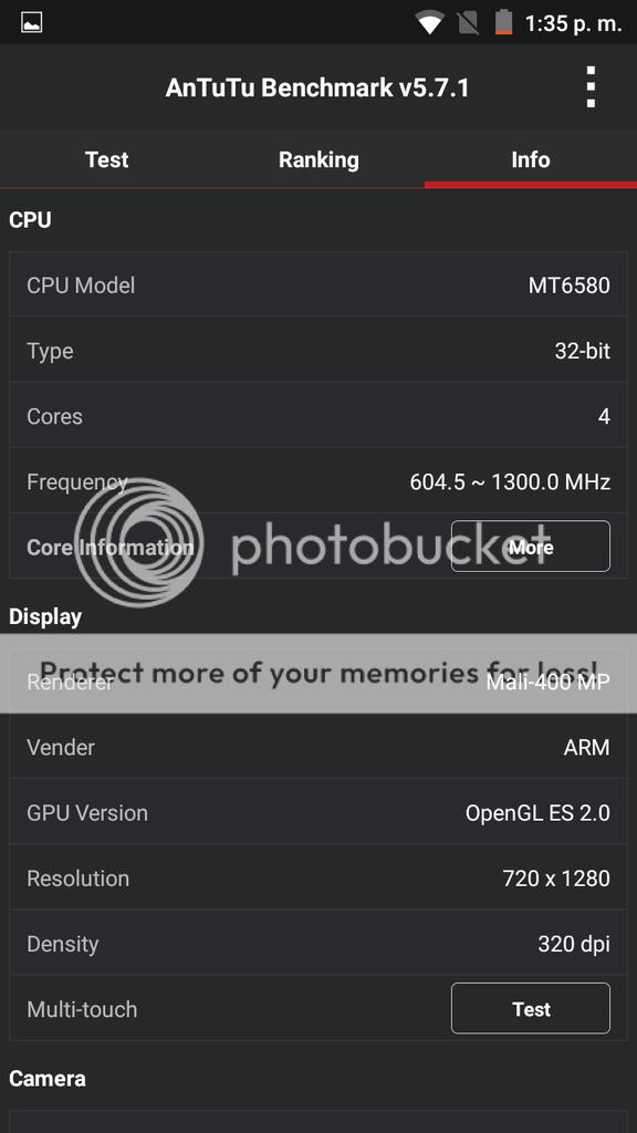 El MT6580 de este teléfono, es un buen procesador, extremadamente parecido al MT6582 de la anterior generación de procesadores de Mediatek, del cual la única diferencia que extraigo es que tiene un escalado de frecuencias distinto, pues su velocidad tope siguen siendo los 1.3GHz y la GPU continúa siendo la Mali 400MP. El hecho de que la frecuencia base sea un poco más alta y un gobernador distinto desde el kernel de Doogee parecen exprimir un poco más la potencia del MT6580 que la que veníamos teniendo con el MT6582. Es un chip de cuatro núcleos que está más que bien considerando el precio del terminal. La relación potencia/consumo parece ser más o menos buena, muy análoga a la del MT6582 o quizás un pelín superior. Bajo el papel la puntuación de Antutu se queda justa frente a los terminales más famosos hoy en día....sin embargo, nos vamos a unos nada despreciables 20300 tantos. Además, la elección de este procesador parece ser buena pues parece cuidar bastante la batería ya que no he notado un drenaje de la batería severo ni tampoco un sobrecalentamiento del terminal con un uso moderado-intensivo.