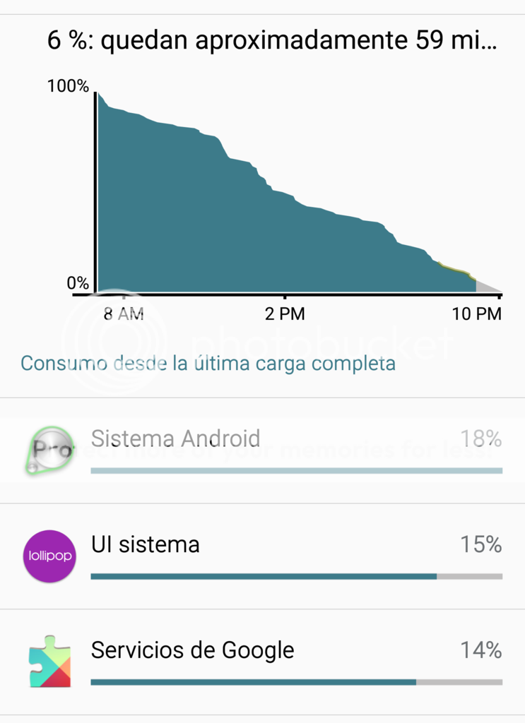 ![]() No se porque siempre me utiliza muchísma batería Android. El uso que le di al móvil fue normal. jugué unos 20 minutos, miré 2 videos cortos en youtube, algunas llamadas y revisando el correo y mensajería. Nada raro para que se me gaste tanto ¿Que será? Saludos! ![]() No se que sera,pero sospecho que es alguna aplicación que está dando por saco y que no damos con cual es. De todas formas el 5.1.1 consume mucho el sistema... a ver si con el 6 se mejora esto. Saludos! Enviado desde mi SM-N910F mediante Tapatalk
