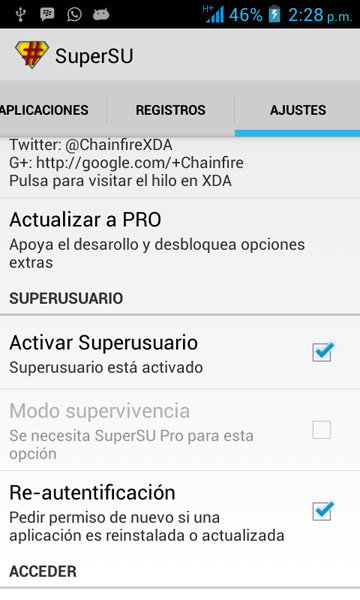 cuando quite el bootloader,el la parte de permisos me salia abajo algo asi como to up root. le di se llevo un rato, se inicio y se puso la barra blanca a cargar, despues de eso instale los superSu y el root cheker y el flashify, cuando instale primero el supeUS y luego el root cheker, cuando le di me realizo una cuanta de 5 seg y le di al boton y me puso algo asi como comgratulation now at root device, con el simbolito v en verde junto al lado del movil eso es ser root si no se lo paso de nuevo donde se encuentra la opcion de superusuario en superSU por favor.