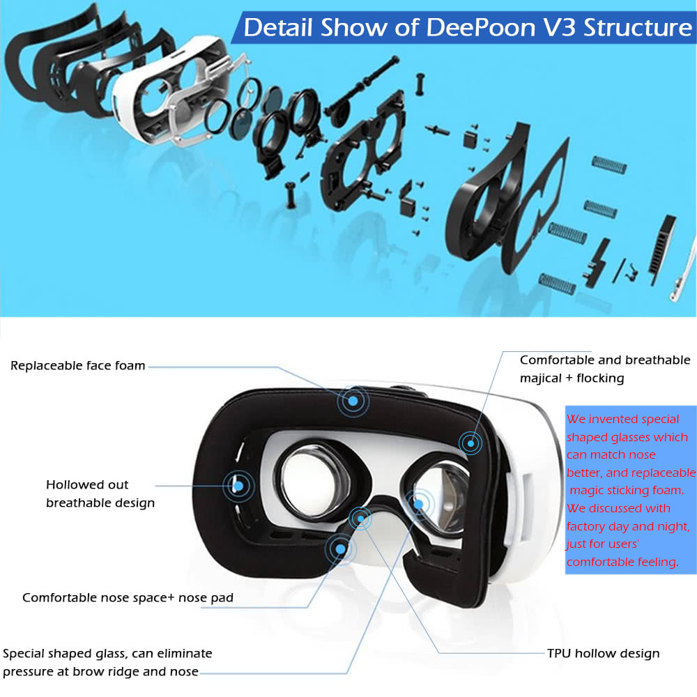 Características DeePoon V3: DeePoon V3 es un gran complemento. Le aporta una maravillosa experiencia de realidad virtual cuando ve películas y juga a juegos. Gafas de realidad virtual, que ofrecen un excelente efecto de imagen 3D y una sensación maravillosa. De alto rendimiento y lentes de alta precisión. Proporcionan una imagen más clara y una mejor vision. No produce fatiga visual o mareos, incluso si lo utiliza durante mucho tiempo. Distancia interpupilar ajustable, para diferentes tipos de personas. (Se puede ajustar ligeramente la distancia entre las dos lentes de resina esférica a través de el botón en la parte inferior de las gafas 3D, con el fin de obtener una mejor experiencia de ver películas.) Viene con férula ajustable, dejando que los teléfonos inteligentes con diferentes tamaños se pueden sujetar firmemente en DeePoon V3 VR. Incorpora una diadema flexible y ajustable para diferentes personas. DeePoon V3 Especificaciones: Marca: DeePoon Número de modelo: V3 Color: Blanco con negro Materiales: ABS + lente esférica de resina + esponja + Cinta de cabeza, etc. Tamaño del artículo: 17 x 10 x 9 cm / 6.69 x 3.93 x 3.54 in Peso del artículo: 279 g / 9.86 oz Tamaño del paquete: 18.5 x 16 x 110 cm / 7.28 x 6.29 x 4.33 in Peso del embalaje 15,4 oz / 437 g Link de compra Tomtop: http://es.tomtop.com/deepoon-v3-virt...tml?aid=C40895 ![]() ![]() ![]() ![]() ![]() ![]()
