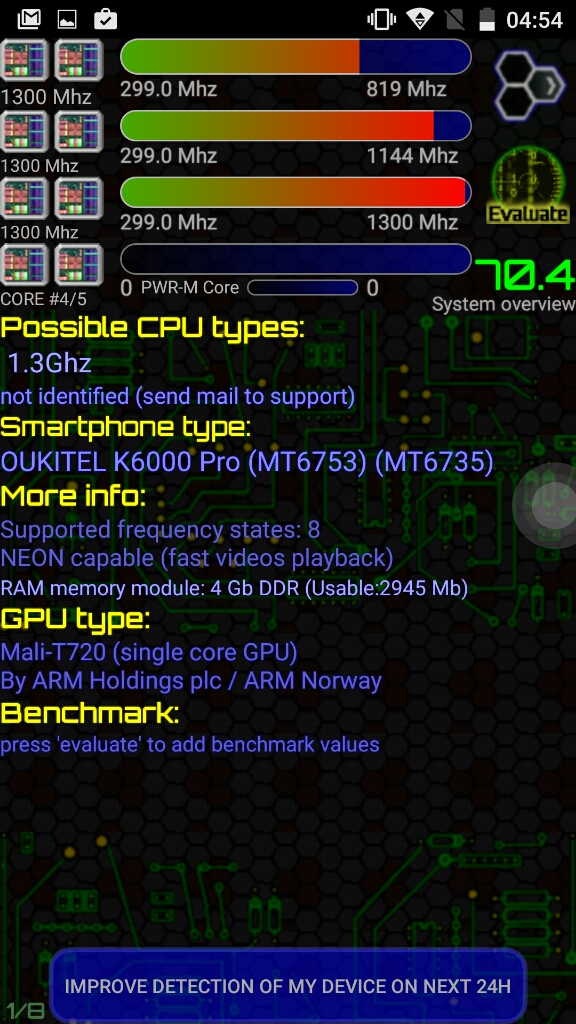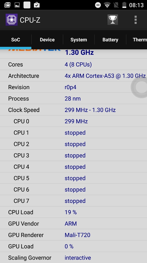 Para una completa lista de especificaciones, sugiero visitar el siguiente enlace: Información desde el propio dispositivoPara tener una fuente fiable de información del sistema, he obtenido información desde el mismo dispositivo, ya sea desde la misma información que me proporciona el sistema Android (que generalmente es mas bien escueta), como utilizando otros programas que logran sacar mucho mas información, y de forma mas detallada, con lo que nos podemos hacer una idea general del dispositivo en su conjunto. Antutu Benchmark System Info CPU / RAM / DEVICE Identifier CPU-ZPara quien no conozca estos programas, decir que un benchmark es un programa o prueba normalizada que se realiza en un dispositivo. Estas pruebas puntúan (generalmente ponderando varios resultados obtenidos) el desempeño de un dispositivo, de manera tal que el puntaje final puede servir para poder comparar de manera simple y directa el rendimiento general entre varios dispositivos. Existen muchos benchmarks en la store de Google, pero en mis pruebas generalmente utilizo los mas populares. Si tienes alguna sugerencia de un nuevo benchmark, déjame un comentario nombrando el programa específico y de la razón, para poder contemplarlo en siguientes reviews. En la práctica, si quieres comparar este dispositivo (del cual estoy comentando en este articulo) con otro que veas por la web, o uno que tu mismo tengas, basta con que encuentres el resultado de alguno de los benchmarks y compararlo directamente con las capturas de pantalla que pongo aquí. Con esto, ya te puedes hacer una idea general de que tal van estas máquinas, comparando sus resultados. Para la ejecución de estos benchmark, las condiciones del dispositivo son:
