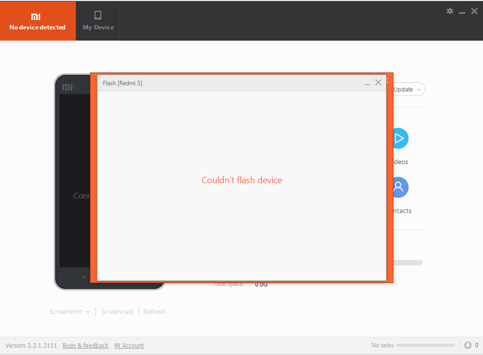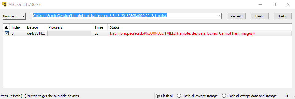 Móvil: Xiaomi Redmi 3 Pro ROM actualmente instalada: 7.9.2.0. estable (con mucho adware, banners en negro, algo de lag...) ¿La ROM instalada está en español?: Sí ROM que se intenta instalar: La última oficial developer Método de instalación utilizado: El del mensaje #2 de este mismo hilo Sistema del PC y arquitectura: W10 64bits Problema experimentado (con todos los detalles): Tengo experiencia flasheando otros móviles, incluido un Mi4. Sin embargo, llevo todo el día, probando, leyendo... y no he conseguido hacerlo con este. El problema viene una vez lo pongo en modo download, pantalla en negro, enchufo y el PC hace el ruido de que lo detecta, pero no sale en ningún lado, en Mi PC Suite y en MiFlash, por tanto, tampoco. En modo fastboot ocurre lo mismo con la única diferencia de que el Mi PC Suite indica lo siguiente, tras una ventana tipo "cargando": ![]() Conectando el móvil desde el launcher inicial sí que lo detecta el ordenador (esto cuando desactivo la depuración, que para flashearlo SÍ que la activo), lo mismo con el Mi PC Suite. Pero desde el modo download y fastboot no. ¿Se te ocurre qué puede ser? Me ha llegado hoy y ya he pedido el código para desbloquearlo en un futuro y rootearlo, pero es que con la ROM que viene ahora es muy engorroso. Añadir que también he probado con otro cable, otras ranuras USB y otros dos ordenadores (un fijo w10 64 y un w7 64) Un saludo y muchas gracias por tu tiempo y conocimientos, Sergio ![]() Recuerda seleccionar bien la carpeta de la ROM y Flash all. |