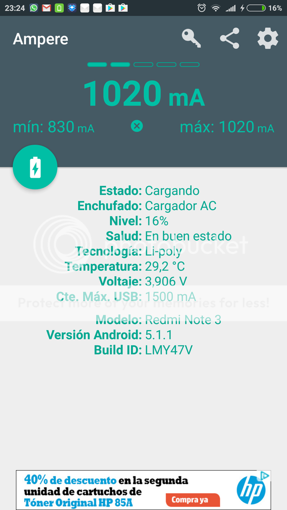 Características Capacidad: 10050mAh Input: 4.8-5.1 V DC Output: 4.7-5.1 V DC Células: Baterías de litio Corriente de salida: 0-3.0 A max 3A Corriente de entrada: >1.8A Tiempo de carga: 6h aprox Medidas: 138x75x20mm Vida media: >500 veces Baterías: lgabf1l1865(LG) Contenido del paquete: 1 x Batería externa 10050mAh 1 x cable microUSB-USB de 30cm 1 x manual de instrucciones Unboxing En este caso se trata de una caja simple de cartón marrón. En la parte frontal vemos la marca del powerbank. Extraemos el powerbank, un cable USB y el manual de usuario. Todo en bolsitas de plástico para evitar que se dañe. Algo que se echa en falta, una bolsita de transporte. Como parece normal, no trae cargador. ![]() ![]() Primeras impresiones Nada más coger el PowerBank, vemos que es robusto y de buena calidad. Está hecho de aluminio anodizado, lo que nos da una sensación de calidad máxima. La textura es suave, sin imperfecciones. Es muy agradable al tacto, aunque deja algunas huellas de dedos. En la parte frontal tenemos la marca serigrafiada con cuatro leds. La parte posterior es lisa, negra sin nada. Los bordes son redondeados. El color es negro y naranja, le da un toque muy moderno y bonito. En un lateral tenemos el botón de encendido (color naranja). Sobre otro lateral tenemos los dos conectores de carga (salida) y el de carga del powerbank (entrada). También tenemos un pequeño led que funciona como linterna. Todos los conectores tienen inscritos la direccionalidad. En el otro lateral tenemos las características del powerbank. Los cuatro Leds indican el nivel de carga: -1->25% -2->50% -3->75% -4->100% Las dimensiones son de 9,8 x 6,5 x 2,2 cm (largo, ancho, alto) y un peso de 213 gramos. Son unas dimensiones adecuadas para la capacidad que tiene. Si quisiéramos más capacidad seguramente se necesitaría aumentar el peso. Según leemos en el manual, tiene un circuito integrado que previene la sobrecarga. En cuanto al cable USB, la primera impresión es que es de buena calidad (nada de cables chinos), aunque mie unos 25cm. ![]() ![]() ![]() ![]() ![]() ![]() ![]() ![]() ![]() Funcionamiento Encendido Cuando enchufamos algún dispositivo el powerbank no se enciende, hay que pulsar el botón de encendido. Cuando se enciende, los cuatro Leds indican la carga (aproximadamente). Si queremos encenderlo manualmente (sin dispositivo conectado) basta con pulsar dos veces seguidas el botón de encendido. Para apagarlo, repetir el proceso. Pasado unos 5s segundos, se apaga (a menos que se conecte un dispositivo). Carga Conectamos el cable al powerbank e inmediatamente empezará a cargar el dispositivo. Cuando el dispositivo se ha cargado, se desconecta automáticamente (el PowerBank). Cuando está cargando un dispositivo, los leds se quedan fijos indicando el nivel de carga. Linterna Para activar la linterna, debemos dejar pulsado el botón de encendido. Se puede usar la linterna mientras se está cargado algún dispositivo. Carga del PowerBank Para la carga, simplemente enchufamos el cable microUSB a la batería y el otro extremo al cargador. Se encienden los Leds y parpadean indicando el nivel de carga actual. Rendimiento El PowerBank venia cargado al 50%, es decir, en torno 5000mAh. Cargué un móvil de 4100mA y se quedó al 90% (sin llegar a carga completa). He de decir que estaba encendido y estaba utilizando el móvil. Por lo que estimo que la capacidad real rondara los 9000mAh, que está muy muy bien. El móvil se cargó a 1080mAh, como la carga máxima que aguanta es de 1,5A, está muy bien. Tardó en torno a 2h30min Cargamos el powerbank con un cargador de 1000mAh y lo dejamos toda la noche, a la mañana siguiente está totalmente cargado (suponemos que el cargador da más de 1000mAh). La luz de la linterna es suficiente para una urgencia, no es un LED Cree lo que monta. ![]() Conclusiones Es una buena batería, con unos materiales con una calidad excelente Las baterías son de una marca reconocida, LG, además de que son utilizadas en otros powerbanks de otras marcas (Xiaomi, por ejemplo). Tiene un buen acabado y la batería parece robusta. Tiene una buena capacidad. Recomiendo su compra. Pros Baterías LG (lgabf1l1865) Precio Calidad de los materiales Capacidad real (más de un 90% de la anunciada) Contras Bolsa de transporte No incluir cargador No incluir un segundo cable USB |