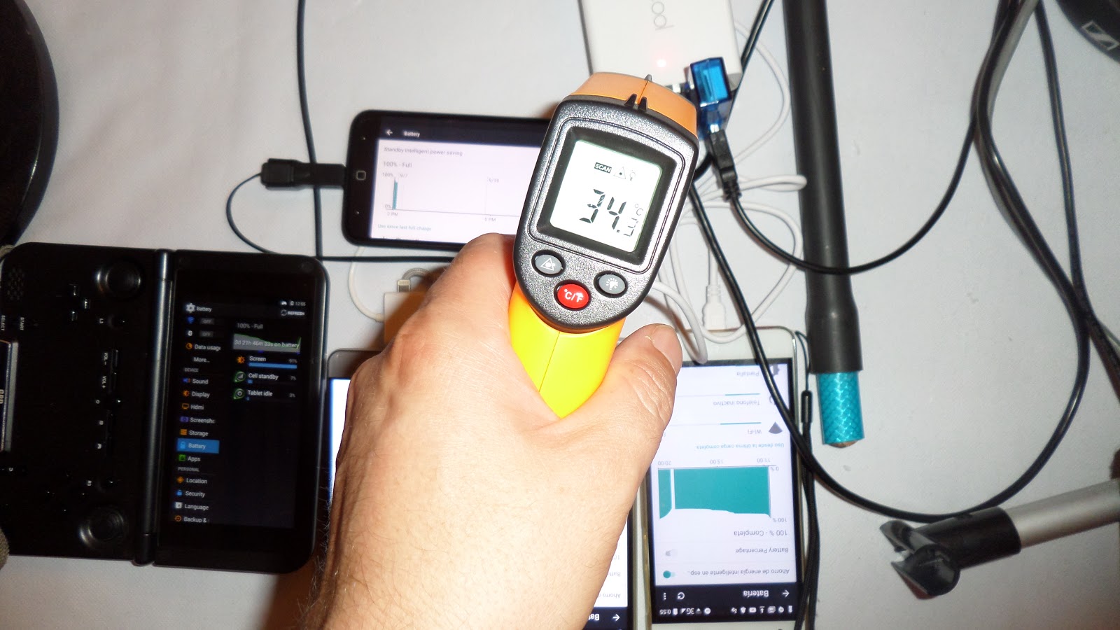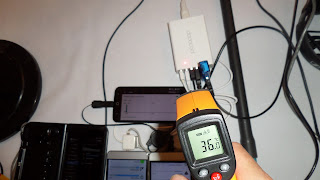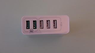 Información desde el propio dispositivoInformación obtenida mediante herramientas de software directamente desde el dispositivo..Para tener una fuente fiable de información del sistema, he obtenido información desde el mismo dispositivo, en este caso, midiendo el voltaje y amperaje de salida de cada puerto. He probado directamente el puerto Quick Charge 3.0 con varios móviles y tablets que tengo con esta funcionalidad, pero en ningún caso logré que se activara esta función. En ningun caso el voltaje sobrepasó los 5.2V. Según he leÃ*do en algunos foros, puede ser que los cargadores Quick Charge funcionan con algunas marcas/componentes especÃ*ficos y por esta razón no he logrado activarlos en mi caso, ya que los dispositivos que he probado no corresponden con la lista de compatiblidad indicada por el fabricante para utilizar la caracterÃ*stica Quick Charge 3.0 En el caso del amperaje si que han existido diferencias entre los distintos dispositivos que he probado, donde en algunos casos apnas llega a 1A, y otros donde ronda los 2A Por hacer una prueba de comprobación, he realizado la misma medida con el cargador especÃ*fico del móvil para ver que datos obtenÃ*a cuando entraba en modo Quick Charge: Como se puede ver, se registran sobre los 7V y 2,24A de carga cuando el móvil está en modo Quick Charge Resumiendo, no puedo concluÃ*r que el cargador no tenga la caracterÃ*stica Quick Charge incluÃ*da, por que precisamente no tengo ninguno de los dispositivos considerados compatibles con este cargador, por tanto y desde este punto, el cargador lo consideraré como un cargador standard USB 2.0, que es como se está comportando. La baterÃ*a de pruebas ha consistido en cargar varios dispositivos (5) al mismo tiempo, y controlar la temperatura del dispositivo durante el periodo de carga Para esto he conectado 4 móviles y una consola android al cargador. Todos los dispositivos se han configurado para que no apaguen la pantalla mientras esté conectado el puerto USB del dispositivo. Al inicio de la prueba el dispositivo presenta una temperatura muy similar a la ambiente, de 34º aprox Al cabo de 25 minutos, registra una temperatura de 43º A los 50 minutos, registra 41º Aproximadamente a la hora y media, registra 39º. Ya se han cargado 3 dispositivos. A las 2 horas y media, ya están cargados todos los dispositivos y el cargador vuelve a bajar su temperatura a 36º Luego de dejar descansar por una hora, el dispositivo tiene una temperatura cercana a la ambiente Si desconecto los dispositivos que, aunque estén cargados, siguen tirando del cargador para mantener encendidas las pantallas, el dispositivo bajarÃ*a un par de grados su temperatura, quedándose a la ambiente. Como en todo producto, nos encontramos frente a un disopsitivo que tiene sus puntos a destacar de forma positiva, también nos encontramos con aquellos puntos o caracterÃ*sticas que, o no cumplen correctamente con lo que se les pide, o simplemente no incorporan una funcionalidad que, en mi opinión, deberÃ*a incluÃ*r. Asimismo, y en parte basado en esta lista de puntos en contra, en donde doy mi punto de vista sobre que aspectos deberÃ*an tenerse en consideración en caso de generar una versión evolucionada o actualizada del dispositivo. Pros
