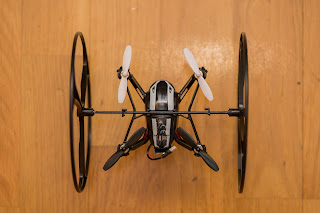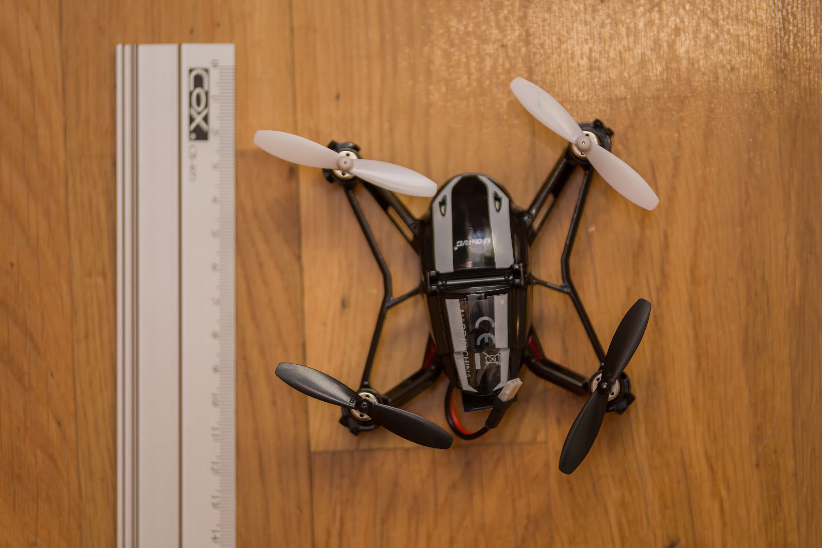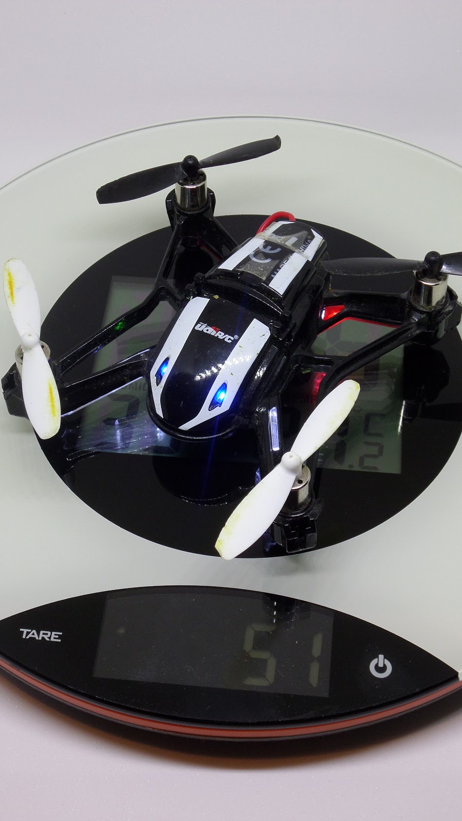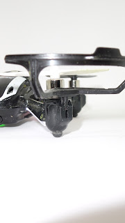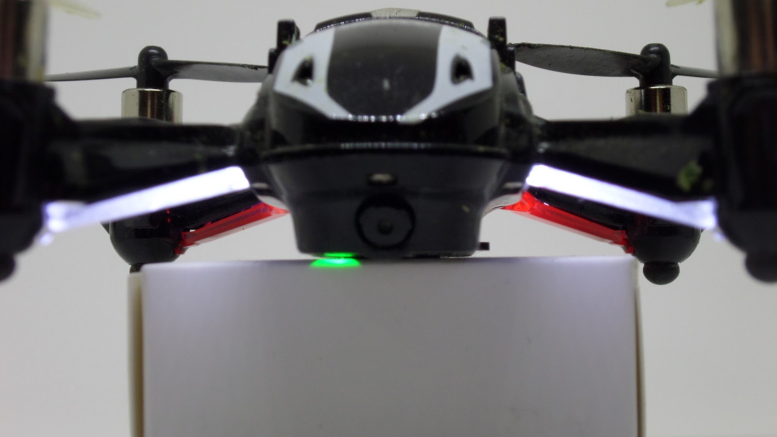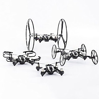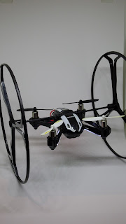 A continuación describiré brevemente cada parte del dispositivo, listando cada componente existente en su estructura, y haciendo comentarios sobre los mismos cuando lo crea necesario. El dron tiene aproximadamente unos 11cm de largo (sin las hélices), un tamaño similar al de una lata de refresco (en la imagen de la izquierda, es una "lata" con el mismo tamaño que una real) En la parte inferior del dron encontramos que los brazos tienen leds de colores que nos ayudarán a utilizar el dron en condiciones de escasa luz Como es habitual, tenemos un color para indicar la parte delantera como la trasera, visto desde arriba las las hélices blancas son la parte delantera y las negras las traseras (aunque estas piezas se pueden intercambiar) además de las luces frontales que nos ayudan a identificarlo, y visto desde abajo tenemos un led blanco-azulado para la parte delantera y rojo para l aparte trasera. Las piezas para acoplar se insertan por unas ranuras que tiene el dron en cada uno de los soportes de los motores. Piezas y modos de uso Dependiendo de la pieza acoplada, tendremos algunas características específicas del dron. Modo "Racer" Por ejemplo si no tenemos ninguna pieza, sería el modo que el fabricante denomina como "Race mode" y es donde el dron mejor se desempeña puesto que no tiene que cargar con peso extra para poder maniobrar. Como se puede apreciar, el dron pesa tan solo 51gr con batería incluída, pero su peso está muy bien distribuído y logra obtener una estabilidad bastante buena considerando el tamaño del dispositivo. Modo "Stunt" El siguiente "modo" es el llamado "Stunt" o de "choque", y basicamente son las protecciones tradicionales que encontramos en los drones en general para que las helices no toquen de forma directa otros elementos como superficies de paredes, o personas. Las piezas para este modo apenas pesan 2gr, con lo que son las que menos impacto tienen sobre el Dron a la hora de volar y que sugiero utilizar frecuentemente para evitar accidentes tanto del dron, como del entorno y personas. Una cosa a comentar es que estas piezas en especial hay que tener cuidado si el dron recie un impacto, por que muchas veces saltan de su sitio y si estamos al aire libre, hay que tener especial cuidado para ver donde caen estas piezas. Modo "Ground" Luego, pasamos al modo con ruedas o "Ground", con el cual podremos "conducir" el dron como si fuese un coche, pero que en cualquier momento podremos hacer despegar del suelo. Cada rueda y su soporte pesa unos 2gr aprox, por lo que el dron en su conjunto queda en unos 58~59gr Modo "Climbing" Finalmente tenemos el modo Escalada o "Climbing", que se conforma por las ruedas de 12cm que protegen al dron, y le permiten "escalar" paredes o ir por el techo, además de que al estar protegido nos permite un vuelo mas seguro si estamos aprendiendo a controlar este dron. Las ruedas y la barra para conectarlas pesan 13gr, lo que hacen que el conjunto pese aproximadamente unos 65gr En este modo es mas seguro aprender a volar, por que las propias ruedas minimizan los golpes quepueda dar el dron (y sus hélices), y al mismo tiempo protegen al dron de objetos externos que le puedan dañar, aunque siempre hay que tener cuidado, ya que estas protecciones son basicamente laterales y dejan al dron en un espacio "cubierto" para evitar que las hélices toquen algo directamente, aunque evidentemente si metemos algo dentro podemos dañar al dron o incluso a nosotros, por lo que siempre hay que tener precaución. Estabilidad de vuelo Sorprende gratamente comprobar lo estable que resulta el dispositivo para el tamaño que tiene. He estado probando el dispositivo al aire libre, con una brisa constante, y el dispositivo se controla estupendamente. Sobre el radio de acción del mando, he realizado pruebas y he logrado controlarlo en distancias de 50mts aproximadamente. Debo repetir estas pruebas por que coincidió que la batería del dispositivo no estaba con suficiente carga y esto podía haber incidido en la potencia de la recepción de la antena, ya que según he leído y visto en las especificaciones el mando debería tener un radio de acción de unos 100mts, por lo que espero que en siguientes pruebas logre llegar a esta distancia, eso sí, por el tamaño del dispositivo creo que 50mts es mas que suficiente para un vuelo sobre todo para principiantes, puesto que con esta distancia y el tamaño del dron apenas si se puede distinguir hacia donde está mirando o tener una perspectiva de la distancia como para realizar maniobras sobre todo si hay obstáculos. El dron cuenta con un modo aprendizaje (que va muy suave, sin movimientos bruscos) y otro de velocidad, que es donde mejor se controla sobre todo en exterior, y en condiciones de brisa o viento leve. Les he dejado el dron a un par de personas que no habían tenido experiencia con este tipo de dispositivos, y aquí es donde se ha hecho muy necesario el kit de protecciones como el de las ruedas, y practicar en una habitación para que aprendiesen los conceptos de vuelo, sobre todo en lo que se refiere a volar girando el dron. Para quienes conocen estos dispositivos sabrán que hay una etapa que aprender y es poder volar cambiando el punto de referencia del "frente" (cuando se gira el dron), y esto puede ser un problema al comenzar a aprender los conceptos de vuelo de estos dispositivos. Para estos casos lo mejor es volar simulando el modo "headless" que aunque este dron no lo tiene, siguiendo la misma lógica se puede controlar el dron. Esto es volar el dispositivo en los 3 ejes (X, Y, Z) sin cambiar el punto de referencia de partida, o lo que es lo mismo, sin girar el dron sobre su eje Z. De esta manera es bastante "sencillo" controlar el dron y desplazarlo por cualquier parte. Si a esto le sumamos las ruedas del modo "Climbing", entonces tenemos una buena forma de comenzar a controlar el dron para ir cogiendo habilidad con el. El mando El stick izquierdo controla el giro en el eje Z (izquierda/d