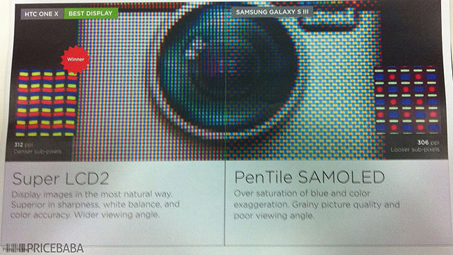 Es una comparativa que puso htc cuando presento su one x intentando hacer ver que el panel superlcd2( una ips fabricada por samsung) de su htc one x era mejor que el superamoled del s3 a misma resolución y tamaño, y tenían toda la razón.