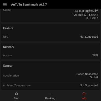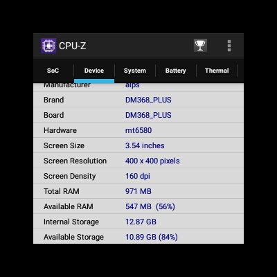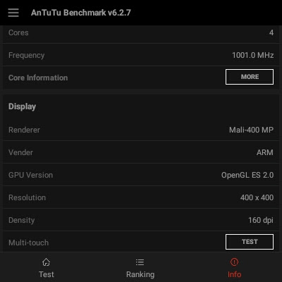*Nota: En algunos sitios s reporta una batería de 450mAh Información desde el propio dispositivoInformación obtenida mediante herramientas de software directamente desde el dispositivo..Para tener una fuente fiable de información del sistema, he obtenido información desde el mismo dispositivo, ya sea desde la misma información que me proporciona el sistema Android (que generalmente es mas bien escueta), como utilizando otros programas que logran sacar mucho mas información, y de forma mas detallada, con lo que nos podemos hacer una idea general del dispositivo en su conjunto. Antutu Benchmark System Info CPU-ZPara quien no conozca estos programas, decir que un benchmark es una herramienta que ejecuta una prueba normalizada que se realiza en un dispositivo. Estas pruebas puntúan (generalmente ponderando varios resultados obtenidos) el desempeño de un dispositivo, de manera tal que el puntaje final puede servir para poder comparar de manera simple y directa el rendimiento general entre varios dispositivos. Existen muchos benchmarks, pero en mis pruebas generalmente utilizo los mas populares. Si tienes alguna sugerencia de un nuevo benchmark, déjame un comentario nombrando el programa específico y la razón, para poder contemplarlo en siguientes reviews. En la práctica, si quieres comparar este dispositivo (del cual estoy comentando en este articulo) con otro que veas por la web, o uno que tu mismo tengas, basta con que encuentres el resultado de alguno de los benchmarks y compararlo directamente con las capturas de pantalla que pongo aquí. Con esto, ya te puedes hacer una idea general de que tal van estas máquinas, comparando sus resultados. Nota acerca de los resultados de los benchmarks Hay que tener en cuenta que estos resultados son meramente referenciales. Es muy probable que si ejecutas estos benchmarks mas de una vez, tendrás mas de un resultado y muchas veces pueden variar de forma sensible. Esto puede suceder por muchos factores (temperatura del dispositivo, carga de memoria mientras se realiza la prueba, conexión a internet, cambios en los sensores como puede ser mientras se mueve el dispositivo, etc, etc). Por esta razón, en muchas ocasiones realizo 3 pruebas de cada benchmark y presento las que mejore puntuación obtiene (por que asumo que es la que mejores condiciones ha tenido para ejecutar dicha prueba) Condiciones de ejecución de los benchmarks Para la ejecución de estos benchmark, las condiciones del dispositivo son:
