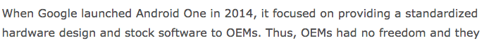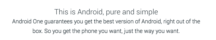 un Android One que de hecho no era más que una versión recortada y liberada de mucho peso y requisitos para ser instalada en teléfonos poco potentes. La intención era la de obtener una mejor experiencia de uso en regiones con teléfonos "baratos", como los países en desarrollo.