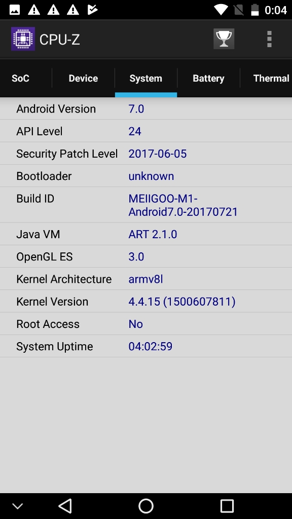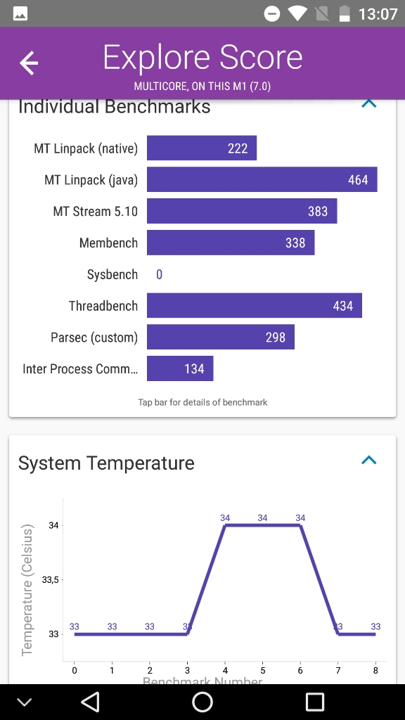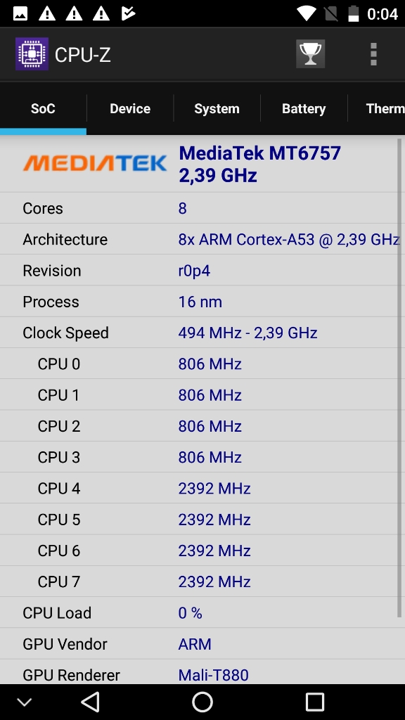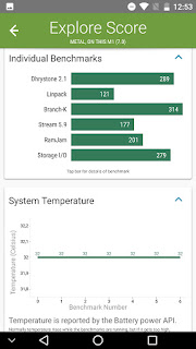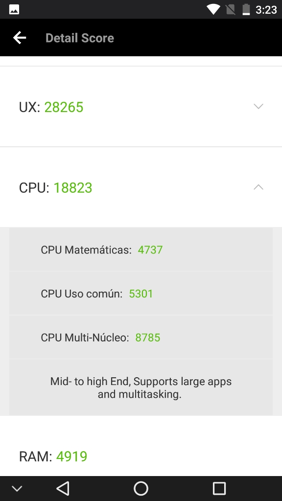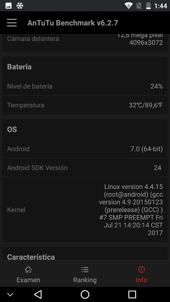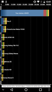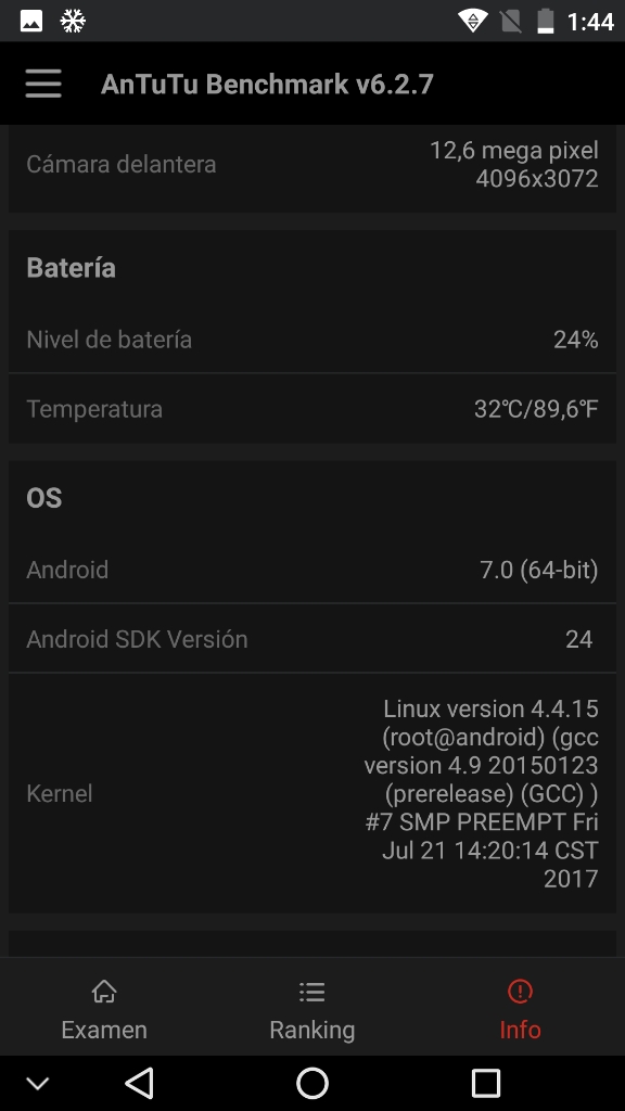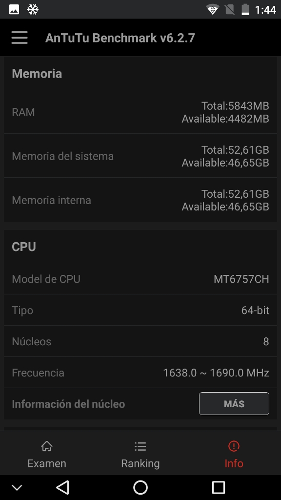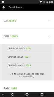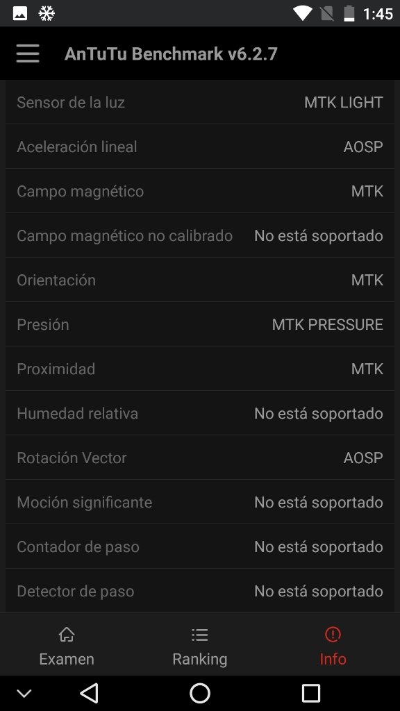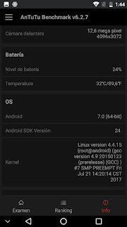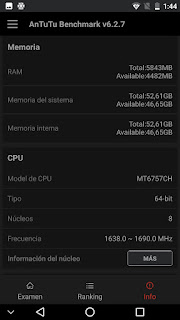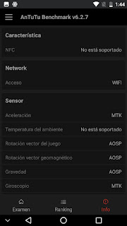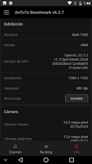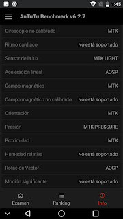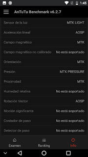 Información desde el propio dispositivoInformación obtenida mediante herramientas de software directamente desde el dispositivo..Para tener una fuente fiable de información del sistema, he obtenido información desde el mismo dispositivo, ya sea desde la misma información que me proporciona el sistema Android (que generalmente es mas bien escueta), como utilizando otros programas que logran sacar mucho mas información, y de forma mas detallada, con lo que nos podemos hacer una idea general del dispositivo en su conjunto. Antutu Benchmark System Info CPU-ZPara quien no conozca estos programas, decir que un benchmark es una herramienta que ejecuta una prueba normalizada que se realiza en un dispositivo. Estas pruebas puntúan (generalmente ponderando varios resultados obtenidos) el desempeño de un dispositivo, de manera tal que el puntaje final puede servir para poder comparar de manera simple y directa el rendimiento general entre varios dispositivos. Existen muchos benchmarks, pero en mis pruebas generalmente utilizo los mas populares. Si tienes alguna sugerencia de un nuevo benchmark, déjame un comentario nombrando el programa específico y la razón, para poder contemplarlo en siguientes reviews. En la práctica, si quieres comparar este dispositivo (del cual estoy comentando en este articulo) con otro que veas por la web, o uno que tu mismo tengas, basta con que encuentres el resultado de alguno de los benchmarks y compararlo directamente con las capturas de pantalla que pongo aquí. Con esto, ya te puedes hacer una idea general de que tal van estas máquinas, comparando sus resultados. Nota acerca de los resultados de los benchmarks Hay que tener en cuenta que estos resultados son meramente referenciales. Es muy probable que si ejecutas estos benchmarks mas de una vez, tendrás mas de un resultado y muchas veces pueden variar de forma sensible. Esto puede suceder por muchos factores (temperatura del dispositivo, carga de memoria mientras se realiza la prueba, conexión a internet, cambios en los sensores como puede ser mientras se mueve el dispositivo, etc, etc). Por esta razón, en muchas ocasiones realizo 3 pruebas de cada benchmark y presento las que mejore puntuación obtiene (por que asumo que es la que mejores condiciones ha tenido para ejecutar dicha prueba) Condiciones de ejecución de los benchmarks Para la ejecución de estos benchmark, las condiciones del dispositivo son: