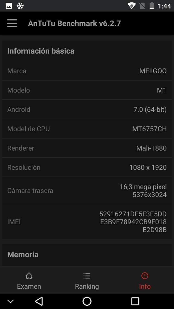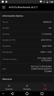 Uso de esta reviewSe permite utilizar esta review, ya sea copiando entero el artículo o partes de el, o referenciándola mediante un link, a cualquiera que lo desee, con la única condición de que se mantenga el autor y un enlace a la fuente original de esta review, y que se encuentra en mi blog. Para actualizaciones sobre este artículo, sugiero visitar el enlace mencionado anteriormente AgradecimientosA la tienda Gear Best, por enviarme una unidad de su producto Smartphone Meiigoo M1para realizar esta review. Acuerdo de renunciaNo me hago responsable de ningún tipo de problema derivado de la implementación de los procedimientos o pautas indicadados en este artículo. Cualquier tipo de modificación que hagas en el dispositivo (como flasheo de una rom, cambio de bios, instalación de programas, configuración, mal ensamblado, etc), será bajo tu responsabilidad. IntroducciónDescripción introductoria del productoEl Meiigoo M1 se presenta como un dispositivo con los recursos suficientes como para no tener que cambiar de smartphone por una temporada, y es que en un solo dispositivo podemos encontrar varias características de los móviles mas avanzados, y todo presentado en una solución con un precio bastante ajustado. Entre las características que se pueden destacar de este móvil, nos encontramos las siguientes. Procesador Helio P20 6 GB RAM 64GB Almacenamiento interno (ampliables mediante MicroSD) Batería de 4000mAh. El fabricante hace además especial incapié en que es una batería segura, de marca SONY. Doble cámara trasera, con tecnología PDAF que permite un autoenfoque mas rápido que las cámaras standard. Además, con esta doble cámara se permiten obtener el efecto tan popular de Bokeh (desenfoque de un plano). El dispositivo viene con Android 7.0 desde fábrica, lo que nos asegura tener un dispositivo actualizado desde el momento de encenderlo. Además, el fabricante asegura (según se puede ver en sus afiches promocionales) que mantendrán actualizado el sistema. Diseño sin uniones de tan solo 9mm y completamente metalizado. Además de todas estas características hay otras a destacar: