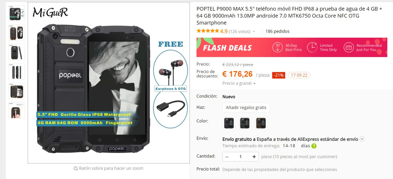 Nuevo smartphone en el mercado, Poptel P9000 MAX Quizá no os suene el fabricante Poptel, pero en China debe ser una marca bastante relevante. No sólo produce smartphones, sino que también los crea para otras marcas. Uno de estos smartphones que lanza con su propia marca es el Poptel P9000 Max. Os suena su aspecto, ¿verdad? sí, el exterior es el mismo que el Oukitel K10000 Max, por ejemplo, ya que está creado por Poptel. Al lío, este Poptel P9000 Max es un smartphone rugerizado, con todo lo bueno y malo que eso conlleva. Por dentro no está nada mal: procesador MT6750V octacore a 1.5Ghz, 4GB de RAM, 64GB de almacenamiento, pantalla de 5,5 pulgadas FullHD y enorme batería de 9000 mAh, como especificaciones más destacadas. Por supuesto, como buen todoterreno, podrás mojarlo y golpearlo sin miedo, ya que tiene protección IP68. Si os interesa, tenéis la ficha de compra AQUI y AQUI. |