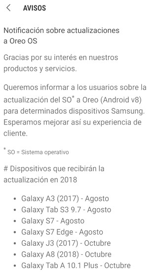 No han sido muy listos dando ese aviso desde Members, porque ahí pone que los S7 y A8 no tienen Oreo y esos modelos ya lo tienen, uno desde final de mayo y el otro a comienzos de julio, curioso que ahí pone Agosto (S7) y Octubre (A8), eso me dice que la lista no es mas que una estimación con plazos muy abiertos que tendrán que actualizar porque no se corresponden