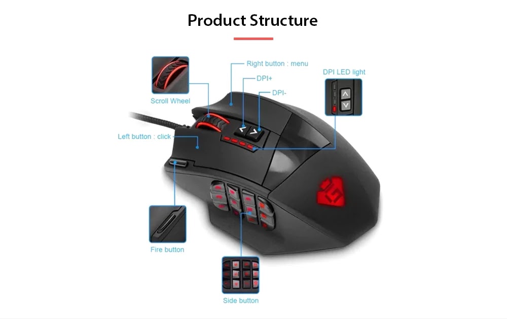 * El ratón realmente tiene 19 botones físicos, pero 18 son programables desde la aplicación del driver. La estructura del ratón presenta un aspecto diferente a la de un ratón tradicional, e incluye los siguientes elementos: