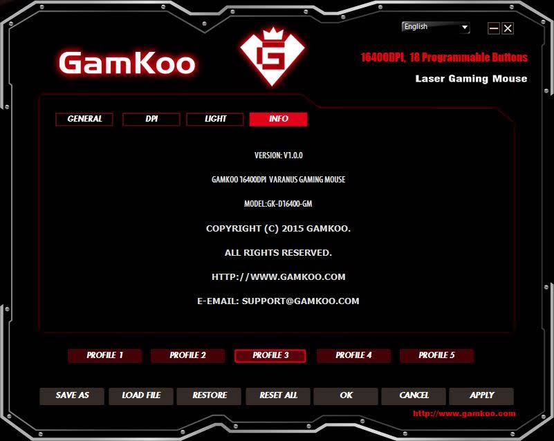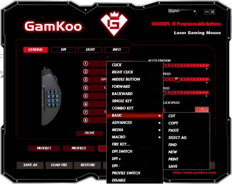 Estos son los botones principales que tengo para jugar, y de momento me está resultando bastante cómodo. Aplicación de configuración En el paquete se incluye un mini-CD que contiene el driver y aplicación para instalar y configurar el ratón. El instalador es bastante sencillo, como el habitual para casi cualquier programa en Windows Una vez instalado, nos dejará un icono en la zona de notificaciones de Windows, para acceder rápidamente a la interfaz El programa viene en distintos idiomas, incluídos Español (aunque en mi caso he preferido utilizar inglés por costumbre) Pantalla de configuración de botones En esta primera pantalla vemos la interfaz de configuración de los botones "standard" del ratón, y que contabiliza 6 botones programables:[*]Botón izquierdo[*]Botón derecho[*]Boón de la rueda/central[*]Botón de disparo[*]Botón para cambiar perfil (Subir)[*]Botón para cambiar perfil (Bajar) Aquí hay que destacar que los botones de cambio de perfil también son programables, con lo que tenemos la posibilidad de ganar mas botones en el ratón en caso de ser necesario. Por cada botón podemos asignar una serie de acciones.