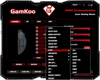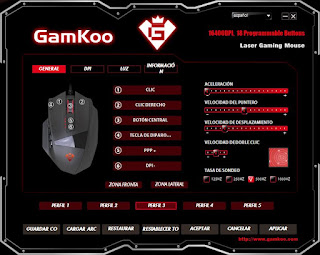 * Estos botones entiendo que corresponden a los de multimedia, pero no he podido comprobarlo, puesto que con los programas que he intentado usarlos, no reaccionan como he supuesto que lo harían. ** La opción "Fire Key", basicamente es para generar una repetición (ráfaga) de clicks izquierdos del ratón. Se pueden configurar las repeticiones (cuantas veces se hará click) y la pausa en milisegundos entre cada click. *** En la interfaz de creación de Macro, es posible crear secuencias de teclas y de ratón (botones), estableciendo un tiempo en milisegundos entre cada caso. La ventana de Macro es la siguiente: En esta imagen se puede ver un ejemplo de macro, para el juego Starcraft, donde he configurado que al presionar el botón, se seleccione el escuadrón 1 (botón "1"), y luego ataque ("A") al lugar donde está el puntero del mouse (Left click) Esta secuencia es muy común en el juego y se utiliza, por ejemplo, para desplazar unidades de un lugar a otro del mapa, sin utilizar el comando "Mover" del juego, que está asignado al botón derecho del ratón, y es que es un movimiento muy poco óptimo puesto que al desplazar las unidades, si encuentran enemigos no se defenderán sino que intentarán llegar al punto indicado. Con "Atacar" el se realiza el mismo movimiento, pero si encuentran enemigos se les ataca. Toda la acción anterior es una pequeña "macro", y que puede ser asignada a un botón del ratón para realizar la acción de forma mas "natural" que presionando 3 teclas (entre teclado y ratón). Como este, hay muchos ejemplos de secuencias de teclas que podemos incluír en las macros, para automatizar algunas opciones y acciones de las que hacemos normalmente en algún juego. En la misma pantalla podemos acceder al panel lateral de botones, y podremos asignar de la misma manera lo que necesitemos a cada uno de estos 12 botones. Pantalla de configuración de DPI En esta pantalla existen 5 niveles de DPI. Cada uno puede ser configurado de forma específica para establecer la velocidad del puntero en cada uno de estos perfiles. Al presionar el botón asignado para subir o bajar DPI, realmente nos movemos entre estos perfiles, por lo que si el usuario quiere, puede establecer los niveles de DPI como quiera, sin tener que hacerlo de forma creciente o decreciente. Cada perfil DPI está asociado con un led en el ratón, de forma qu epodemos saber en todo momento que configuración estamos utilizando de las que hemos asignado al ratón El perfil "0" es cuando no hay ningún LED iluminado. Además, este perfil se muestran en esta pantalla con los indicadores circulares de la izquierda. En el ejemplo, se está utiliando el perfil número 3 (en el ratón hay 3 leds rojos iluminados) Pantalla de configuración de Luz/Light En esta pantalla podemos configurar el color y comportamiento de la luz del ratón. El color es uniforme para todo el ratón, excepto para los indicadores de perfil DPI que son fijos en color rojo. Aquí se ve el control de los 5 colores base del ratón, y las tonalidades que tiene cada uno de ellos. Además, se puede personalizar un color diferente, el cual basicamente será la mezcla de los colores base para conseguir el nuevo. En la aplicación hay un error en la imagen, puesto que muestra el color de la rueda en otro color del seleccionado (está fija en rojo), pero también cambia en función del color elegido. Además, en esta pantalla se puede configurar el "breathing" o respiración, que es ese efecto de subir y bajar suavemente la intensidad en un intervalo de tiempo, o dejar la luz fija activada o desactivarla completamente. Pantalla de Información Como su nombre indica, es una pantalla con información del driver y aplicación Como curiosidad, el sitio web indicado en esta página no existe, pero hay referencias (drivers) para descarga en la página de Rocketek. Perfiles de configuración Además de lo anterior, existe la posibilidad de generar perfiles de configuración, donde asignamos cada botón del ratón, DPI y esquema de colores, y guardarlos como un fichero de perfil. La aplicación puede contener hasta 5 perfiles distintos definidos al mismo tiempo, y que se cambian ya sea con la aplicación, o con el botón inferior del ratón. Esto último lo he encontrado especialmente útil, ya que se encuentra en una ubicación que hace difícil que presiones el cambio de forma accidental, y es una forma de no depender de la interfaz del programa para poder cambiar el perfil actualmente en uso Usos prácticos que puede tener el cambio de perfil son varios. En mi caso tengo actualmente 3 perfiles principales: