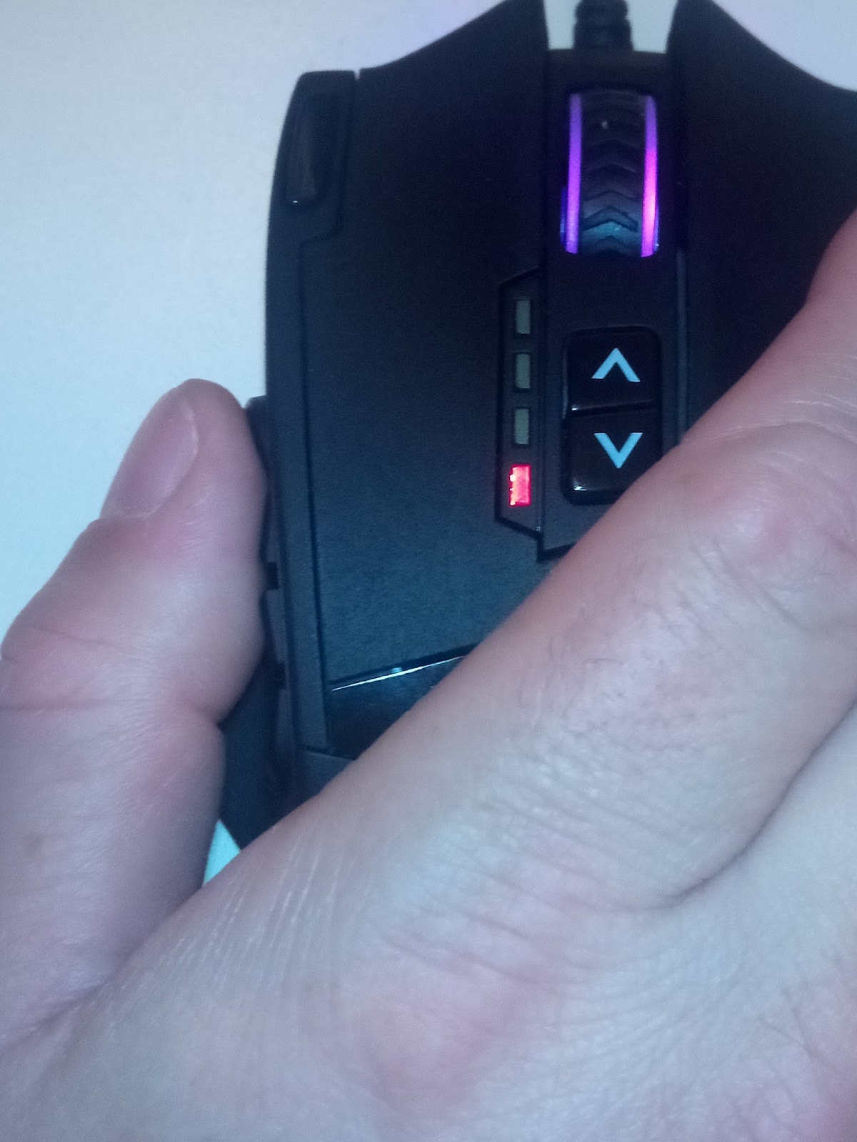 La disposición de los botones está diseñada en 2 grupos principales en forma de hendidura. Cada grupo cuenta con 2 columnas de 3 botones cada uno. En esta imagen se pueden apreciar los 2 grupos de botones y su forma en hendidura para poder identificarlos rápidamente con el pulgar. Aquí se puede apreciar en la imagen de la izquierda la posición del pulgar en el grupo superior (botones 1 al 6) y en la imagen de la derecha en el grupo inferior (botones del 7 al 12) Vista generalEl botón de disparo es un elemento bastante particular del ratón. Está en una posición muy cómoda de utilizar y tiene la dureza suficiente para que no se presione por error, pero con un acceso muy fácil al mismo. Lo mismo sucede con los botones de cambio de perfil de DPI, que son lo bastante duros para que no se presionen por error cuando utilizamos el ratón. Primera impresión y comentarios generalesEn general no soy un usuario de productos "PC Gaming", mas allá de jugar con mandos o tener un teclado multimedia con teclas retroiluminadas, pero el concepto "gaming" realmente no ha calado en mi como para plantearme adquirir productos para juego específico. También creo que merece la pena comentar que pocas cosas juego en el ordenador que requieran teclado y ratón, pero que ultimamente estoy muy centrado en jugar Overwatch, juego con el cual me ha dado oportunidad de probar este accesorio, y alguna partida casual de Starcraft. En el caso de Overwatch, la configuración general del ratón la he hecho conicidir con algunas funciones predefinidas del juego y centrar el uso de la mano izquierda casi exclusivamente en los controles de movimiento con las teclas WASD, por ejemplo, tengo asignadas todas las teclas del ratón, pero las mas importantes las tengo así en el panel lateral: