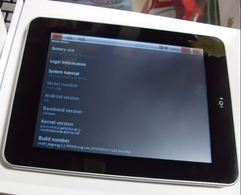 CPU : Cortex-A8 MCIMX515 / 1Ghz Memoria : DDR512MB Disco duro : 4GB NAND FLASH Sistema operativo: Android 2.2 Pantalla: 8" inch TFT LCD tactil Resolución : 800*600 (4:3) 3G: USB 3G WIFI : Wireless LAN 802.11b/g USB para teclado externo Y USB para ratón externo Puertos USB : 2 USB 2.0, 1 Puerto USB Alta velocidad OTG HDMI : Soporta HDMI 1080P*720P Ranura tarjeta Micro SD Efecto sonido : 2 Altavoces 0.5w stereo Entrada micrófono y auriculares Batería : 4000MAH Duración bacteria 4-6 horas con gestor de batería Support : quick Office WORD, EXCEL, POWERPOINT, PDF, TXT, Instant Messaging Tools : MSN, SKYPE, E-mail Internet Browser Internet Browser Other functions :Support Games , E-book, FM Digital Photo Frame support JPG,BMP,PNG,GIF,TIFF… Audio : Soporta MP3,WMA,MP2,OGG,AAC,M4A,MA4,FLAC,APE,3GP,WAV Video : AVI, rm, rmvb, MKV, WMV, MOV, MP4,PMP,MPEG, MPG, FLV, 3GP,MPG, Flash etc.