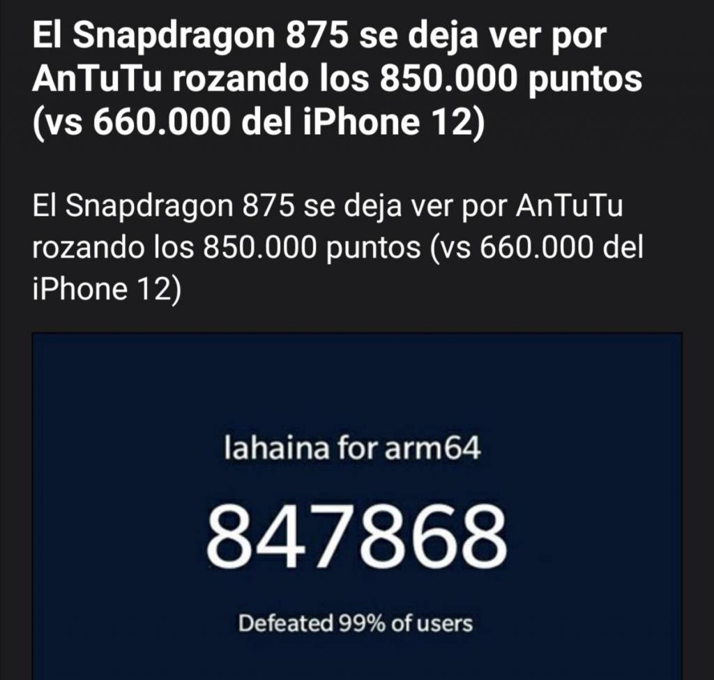 Si el exynos 1080 llega a 600.000 puntos seguro que el snapdragon 875 llega a 900.000,van un paso por detrás y con la GPU Mali otra vez....no decían que iban a poner una GPU de AMD ?