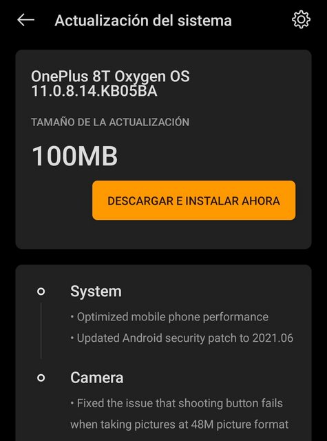 Para Europa es la compilación 11.0.8.14.KB05BA - Changelog/Novedades: • System - Optimized mobile phone performance - Updated Android security patch to 2021.06 • Camera - Fixed the issue that shooting button fails when taking pictures at 48M picture format - Hilo Oficial: https://forums.oneplus.com/threads/o...us-8t.1451601 - Foro Oficial: https://forums.oneplus.com/forums/oneplus-8t - Hilo Repositorio XDA: https://forum.xda-developers.com/t/o...uilds.4193183 - Descarga/Download: • OxygenOS 11.0.8.14 (EU) (OTA Completa): Descarga Pinchando AQUÍ Saludos