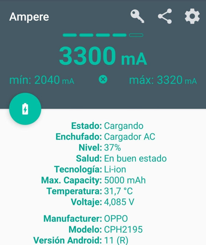 Me explico, la batería es compatible con carga rápida 18W, pero solo empaquetan cargador de 10W (5V x 2A), utilizando el cargador de un motorola moto g pro 2020 que tengo por ahi guardado y que dispone de 9v 2a, 5v 3a y 12v 1.5a, y haciendo las respectivas mediciones, este oppo, con un cargador de similares características cargará con 5V 3A, 15W (el marketing de los 18W), lo cual se agradece, ya que 4000mah o mas de los 5000 de este terminal, a 5V 2A, se te va la vida esperando.Por lo visto el tema del cargador de solo 10W es un problema en muchos móviles de gama entrada 5G xiaomi, redmi, poco, oppo, etc...no se si por ahorro de coste o que andan escasos de componentes para los de 18W y no les compensa en esa gama. Captura de Ampere: