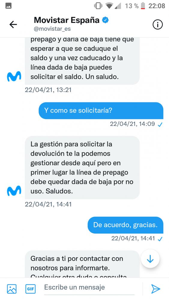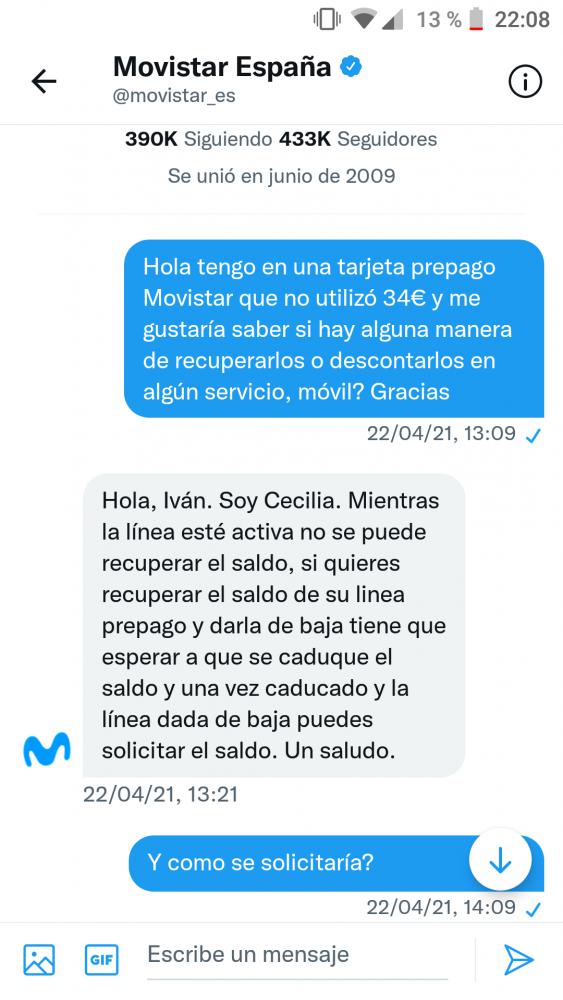 Visto el modo de proceder de Movistar se resume en : quieren quedarse con nuestro dinero. ¿Hay que hacerlo por carta y dar otra linea para las comunicaciones? ¿Y las organizaciones consumidores y mismo ministerio no dicen nada? El proceso tiene que ser mucho más sencillo y claro y razonar por qué no devuelven ese saldo que ellos mismos están diciendo que se tiene. Si uno tiene 70 o 100€ ¿ también se lo váis a quitar?¿ Y la razón: desetimado simplemente y ya está?