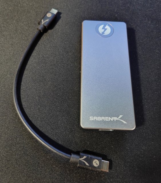 También vendo una caja externa para SSD M.2 con conexión Thunderbolt 3 de la marca Sabrent. Incluye cable Thunderbolt.