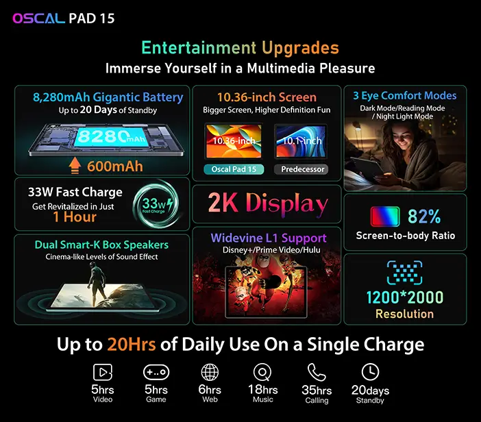 ![]() Peso pluma y diseño elegante - 7.6mm Delgado y 449g Ligero, Opciones de Color: Verde Seafoam y Gris Estelar Basado en las imágenes publicadas oficialmente, Pad 15 está diseñado para ofrecer la máxima portabilidad y comodidad, con un perfil increíblemente delgado de 7,6 mm y un marco ligero como una pluma de 449 g. Estéticamente, Pad 15 destaca con dos opciones de color únicas. Elija entre el vibrante verde Seafoam para un aspecto alegre y desenfadado o el sofisticado gris Stellar para una apariencia elegante y profesional. En cualquier caso, Pad 15 ofrece a los usuarios la libertad de elegir el estilo que mejor se adapte a sus gustos personales. ![]() No.1 Actualizaciones de entretenimiento: Sumérgete en un placer multimedia - Pantalla Full View 2K de 10,36 pulgadas más grande + Soporte 1080P Widevine L1 + Altavoces Smart-K Box duales + 3 modos de lectura Para proporcionar un placer multimedia envolvente, Oscal Pad 15 cuenta con una pantalla 2K Full View de 10,36 pulgadas más grande, que ofrece detalles más realistas para una experiencia visual agradable. Los usuarios pueden ver sin problemas las películas más taquilleras y los programas más populares, jugar con amigos o participar con claridad en videoconferencias y clases en línea. Gracias a la compatibilidad con Widevine L1, los usuarios de Oscal Pad 15 pueden disfrutar de sus vídeos favoritos en alta definición 1080P en plataformas como Disney+, Prime Video y Hulu. Para proporcionar una deliciosa experiencia de sonido, el Pad 15 ha sido equipado con dos potentes altavoces Smart-K Box integrados, que permiten a los usuarios sumergirse en una experiencia de audio y vídeo similar a la de un cine en casa. Además, Oscal Pad 15 ofrece tres modos de lectura. El Modo Oscuro reduce la fatiga visual con una interfaz más oscura. El Modo Lectura facilita la lectura concentrada de textos creando un entorno de lectura saludable. Mientras tanto, el Modo Luz Nocturna minimiza la exposición a la luz azul dañina, aliviando eficazmente la fatiga ocular. ![]() - Batería más grande de 8.280 mAh con carga rápida de 33 W: Hasta 20 horas de uso diario, garantizando un maratón de entretenimiento ininterrumpido Para ayudar a los usuarios a eliminar por completo las preocupaciones sobre la duración de la batería, se rumorea que el Oscal Pad 15 contará con una batería más grande de 8.280mAh. Una sola carga puede soportar hasta 20 horas de uso diario, 6 horas de navegación web o 5 horas de reproducción de vídeo, garantizando un maratón de entretenimiento ininterrumpido. Además, el Pad 15 soporta carga rápida de 33W, lo que significa que puede cargarse completamente en sólo una hora, permitiendo a los usuarios disfrutar de un día completo de entretenimiento sin preocupaciones. No.2 Mejoras de eficiencia: Rendimiento asombroso para trabajar, aprender y entretenerse en cualquier momento y lugar - Octa-core Unisoc T606 + Hasta 16GB RAM + 256GB ROM + Hasta 512GB TF Card Expansion + Smart Pre-loading Diseñado para ofrecer una eficiencia sin igual para el trabajo, el estudio y el entretenimiento sobre la marcha, Oscal Pad 15 se rumorea que cuenta con un procesador octa-core UNISOC T606 con una impresionante puntuación Antutu benchmark de 276.644. Su GPU Mali-G57 perfectamente integrada garantiza un rendimiento fluido incluso en los juegos más exigentes desde el punto de vista gráfico y una reproducción de vídeo envolvente. Además, Oscal Pad 15 admite hasta 16 GB de RAM, 256 GB de ROM y hasta 512 GB de expansión mediante tarjeta TF. Esto significa que no encontrarás ningún problema, tanto si estás inmerso en un entretenimiento fluido, como si realizas varias tareas a la vez o guardas un tesoro de documentos esenciales, fotos preciadas y vídeos dignos de un atracón. Gracias a la tecnología de vanguardia Smart Pre-loading, Oscal Pad 15 ha aumentado la velocidad media de inicio de aplicaciones en un 15%, elevando su eficiencia a un nivel completamente nuevo. ![]() - Ventana múltiple y pantalla dividida + modo PC + lápiz óptico gratuito Para disfrutar de una experiencia similar a la de un PC en el trabajo, el estudio y el ocio, las funcionalidades de multiventana y pantalla dividida del Pad 15 permiten a los usuarios abrir diferentes aplicaciones en la misma pantalla de forma simultánea. Esto satisface necesidades como ver vídeos mientras se toman notas o investigar mientras se escribe un ensayo. Además, Pad 15 puede transformarse en un portátil conectando un teclado y un ratón Bluetooth en modo PC, lo que agiliza la edición rápida de documentos y acelera la productividad tanto en el trabajo como en el estudio. Junto con un lápiz óptico gratuito, los usuarios pueden tomar notas, garabatear y dibujar de forma realista, entre otras muchas funciones. No.3 Actualizaciones de la cámara: Claridad fotográfica mejorada como nunca - Cámaras frontal de 16 MP y trasera de 13 MP + Google Lens Para satisfacer las necesidades diarias de estudiantes y trabajadores novatos a la hora de capturar conferencias y reuniones, se rumorea que Oscal Pad 15 vendrá equipado con una cámara frontal ultra nítida de 16 MP, perfecta para desbloquear el dispositivo con reconocimiento facial, tomar selfies nítidos y participar en videochats nítidos. Por si fuera poco, su cámara trasera de 13 MP hará que las reuniones virtuales, los cursos en línea y las videollamadas con los seres queridos sean pan comido. Además, los usuarios también pueden beneficiarse de la función Smart Google Lens integrada, que ofrece una forma práctica de escanear e identificar objetos, traducir texto y explorar el mundo que les rodea. ![]() Nº 4 Mejoras de comodidad: Experiencia de usuario más fluida - DokeOS_P 3.0 basado en el último Android 13: gestión del sistema + cámara frigorífica + protección DAC y MAC Para los usuarios que buscan una experiencia de uso fluida y segura, Oscal Pad 15 vendrá precargado con DokeOS_P 3.0 basado en la ú