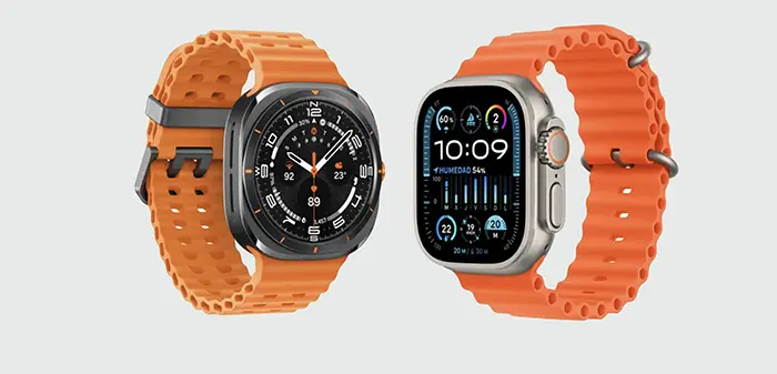 Si en lo único que se le parecen es en la correa, en lo demás se le parece como un huevo a una castaña, en nada, el de Apple es entero cuadrado, y el de Samsung la esfera es circular y luego el bisel es rectangular, seguimos con las diferencias, el de Apple en el lado derecho tiene una corona y un botón, el de Samsung son tres botones, el de Apple en el lado izquierdo tiene el botón naranja y el altavoz, en el de Samsung, el altavoz.