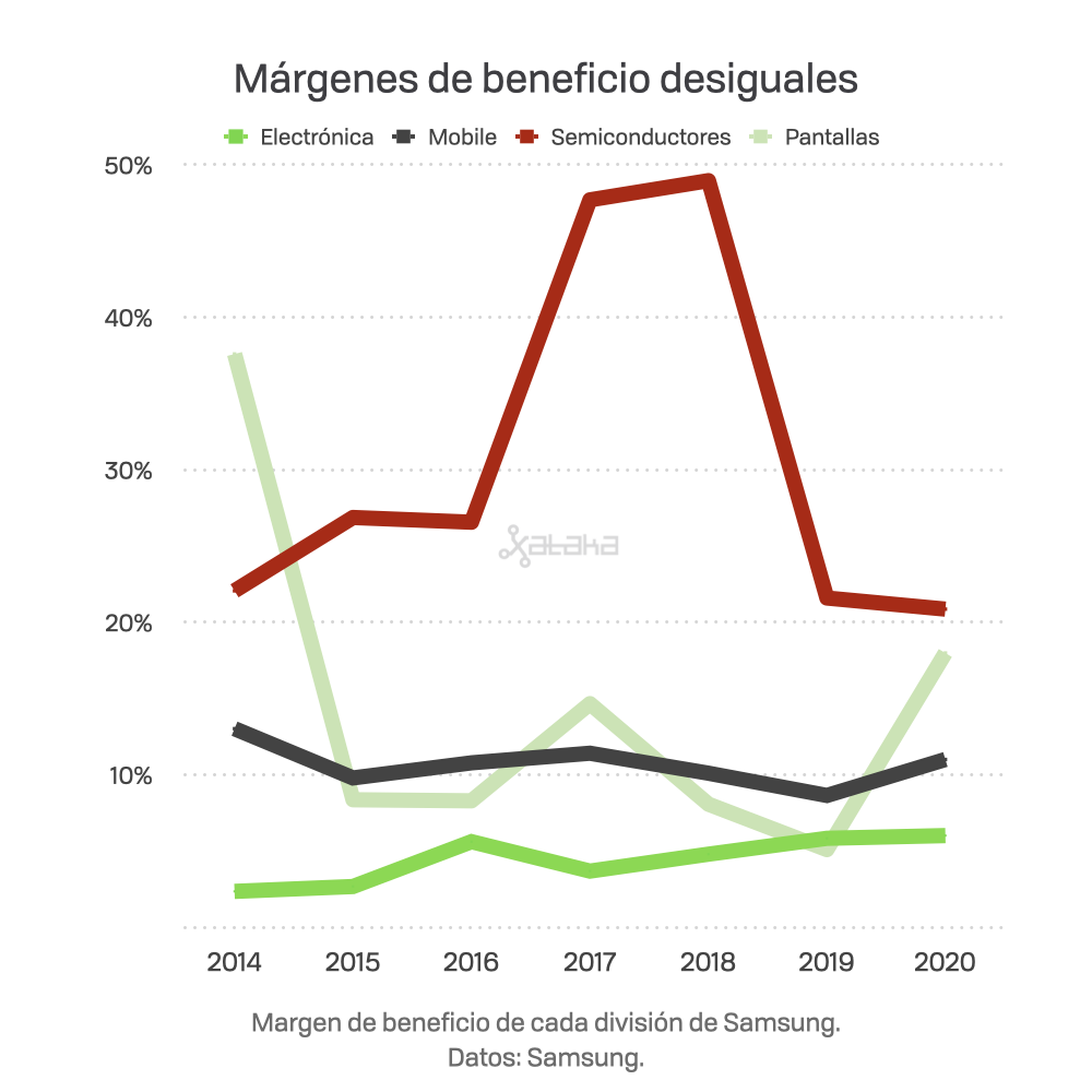 ![]() Los smartphones de Samsung son, de hecho, los productos que más ingresos suponen a la compañía Cita:No es casual, 2020 fue el año de la pandemia, cuando más electrónica de consumo demandamos los usuarios para paliar el nulo ocio al exterior, y también el año en que Apple llevó los paneles OLED a todos sus nuevos iPhone, al contrario que en años anteriores, cuando solo los modelos de mayores precios equipaban estas pantallas. Samsung, proveedor de sus paneles OLED, se benefició de esta decisión de Apple, quien es su gran competidor y al mismo tiempo su cliente VIP.