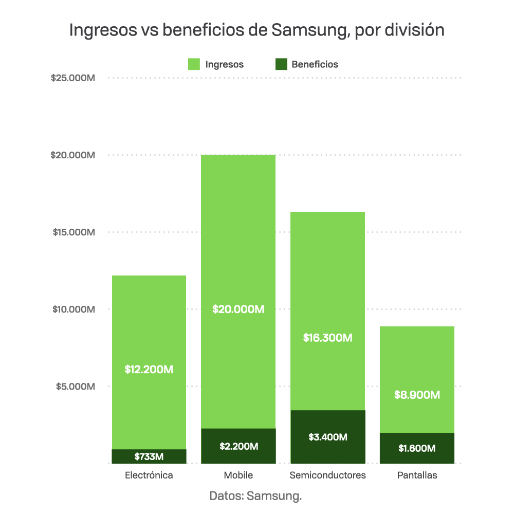 ![]() ![]() Aunque el grueso de la facturación de Samsung lo componga su división Mobile, esta no le deja tantos beneficios como la mencionada de semiconductores. ![]() ![]() Samsung Heavy Industries, el segundo mayor constructor de barcos del mundo; o Samsung Life Insurances, una aseguradora con sede en Seúl, así. como su agencia de relaciones públicas y marketing, Cheil Worldwide, o su participación en Renault-Samsung, la marca coreana resultante tras la venta de su negocio automovilístico a Renault en los años noventa
