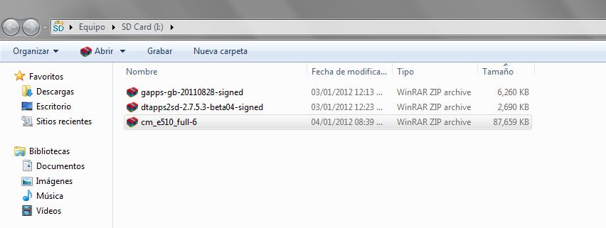 Lo que sigue ahora es trasnferir los 3 archivos mencionados en la parte de arriba del post que son: la ROM, el A2SD Darktremor, y las aplicaciones de google, usando algun adaptador para conectar directamente la PC, quedando en la raiz de la SD como se ve en la imagen:
