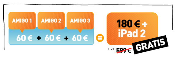 porque si traes 3 amigos al ADSL de JAZZTEL entre el 1 de enero y el 31 de marzo, consigues un iPad 2 sin sorteos. Además seguirás llevándote de 60€ de descuento en factura por cada amigo que venga de tu parte "Me los descuentan en la factura". Y ellos se llevarán 30€ de descuento "Ustedes".