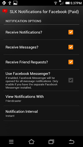 Resumen: Obtener instantánea notificaciones de Facebook en tu teléfono Android! ¿Cansado de no obtener notificaciones de Facebook en tu teléfono Android que todo el mundo con un iPhone lo hace? Entonces esta es la aplicación para usted. Recibe al instante las notificaciones de Facebook en tu teléfono Android! ¿Cansado de no obtener notificaciones de Facebook en tu teléfono Android que todo el mundo con un iPhone lo hace? Entonces esta es la aplicación para usted. Esta aplicación utiliza conexiones de su teléfono ya hace en Google, no va a utilizar cualquier duración de la batería adicional en el teléfono (a diferencia de la aplicación de acciones de Facebook que se come casi la mitad de la batería en la mayoría de los dispositivos cuando están en las notificaciones), que casi no utiliza los datos y no se ejecuta en segundo plano constantemente como aplicaciones de notificación de otros. Usted será notificado de todos los regulares de las notificaciones de Facebook, mensajes y solicitudes de amistad. * Esta aplicación sólo es compatible con un dispositivo por cuenta de Facebook, si usted está usando esta aplicación en más de un dispositivo con la misma cuenta de Facebook, las notificaciones serán erráticas. Presentar los problemas y sugerencias aquí: http://www.google.com/moderator # 15/...27 & t = 1dd427.40 * IMPORTANTE: Si usted cambia su contraseña de Facebook, usted tendrá que abrir la aplicación y cerrar la sesión y vuelva a entrar para comenzar a recibir las notificaciones de nuevo. * Nota: Si usted no permite que todos los permisos de Facebook para esta aplicación no será capaz de enviar notificaciones. * Si usted tiene un problema, ponerse en contacto conmigo a través de la opción en la aplicación. Si usted lo publique como un comentario y decir que no funciona, no voy a responder. No hay manera para que los desarrolladores responden, o póngase en contacto con las personas que comentan (aún es muy pronto). ![]()