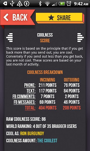 ![]() * Nombre del programa/juego: Bragger * Versión: v1.1.1 * Descripción completa: Requisitos: Android 2.2 + Resumen: Bragger es una revolución en la medición social. Utilice Bragger para obtener conocimientos sin precedentes en su personalidad, amigos y relaciones. Tecnología única Bragger reúne a las llamadas, texto y datos de Facebook para el análisis más profundo y preciso de su vida social nunca. Su información personal, y el fanfarrón ideas recibe de él, le pertenecen a usted solo, pero por favor, no dude en presumir. Sus comunicaciones personales formar una representación inquietantemente precisa de su vida social. Estadísticas Bragger se divide en 3 secciones: -Tu: ¡Qué bueno es usted? ¿Cómo se comunican? ¿Es usted más en los hombres o las mujeres? ¿Es usted un día o una persona de la noche? Qué Starsigns está en vosotros? La sección usted responde a estas preguntas y más. -Amigos: Bragger clasifica tus amigos, y le dice que se mueve hacia arriba y hacia abajo que se mueve. Bragger ofrece una biografía detallada sobre cada uno de tus amigos con ideas sorprendentes y divertidos. -Relaciones: ¿Le batida? Elige a alguien de tus contactos, y analizar la relación. Vea como el teléfono y los hábitos de facebook puedo decir que es dominante en una relación, y por qué. --- Con fanfarrón que puedas --- -Mida su frescura -Aprender más sobre sus hábitos -Clasifique sus amigos -Obtener bios detalladas con cada amigo -Analizar las relaciones -Comparte la información con tus amigos * Imágenes: