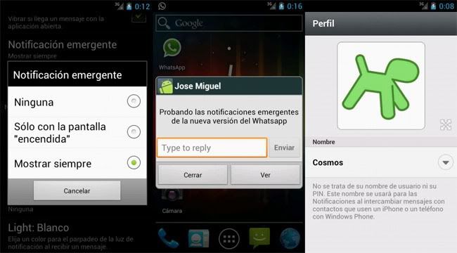 Lo tengo puesto de forma que salte la ventanita que veis en la imagen del medio con los mensajes normales, así hasta puedo contestar en el momento, y con los mensajes de grupos que son mucho mas pesados y hay mil tengo quitado hasta el sonido para siempre