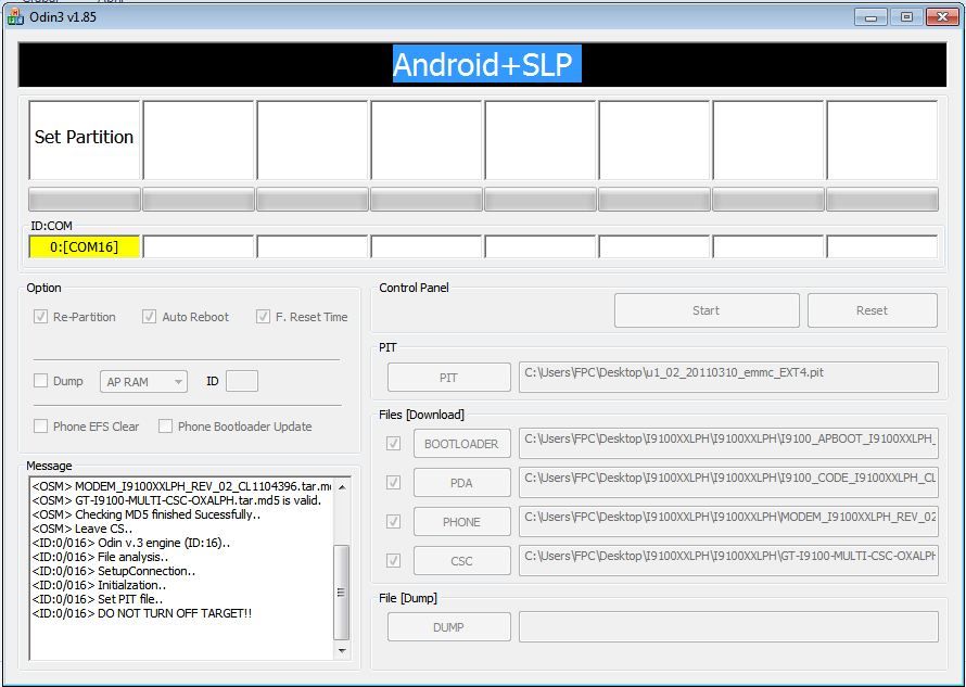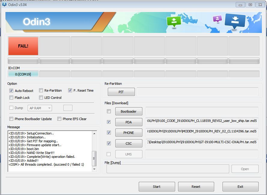 Con el Odin mete solo el .pit (con re-partition marcado) A mi con eso me dio el PASS correcto, luego se reinicia y sigue con el mismo problema. Lo desconectas del PC, cierra el Odin. Vuelve a ejecutar el Odin, y conecta el movil al pc, cuando te lo reconozca el Odin, carga la PDA I9100GXXLSR_I9100GXEFLSR_XEF, porque por lo que veo en la imagen, esa es para un 9100, no para un 9100G. La que te digo es la original. A mi con eso me hizo la carga correcta, arranco el movil y todo perfecto. Espero que te sirva! |