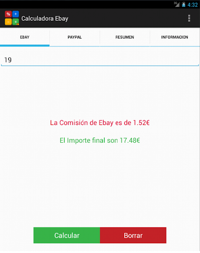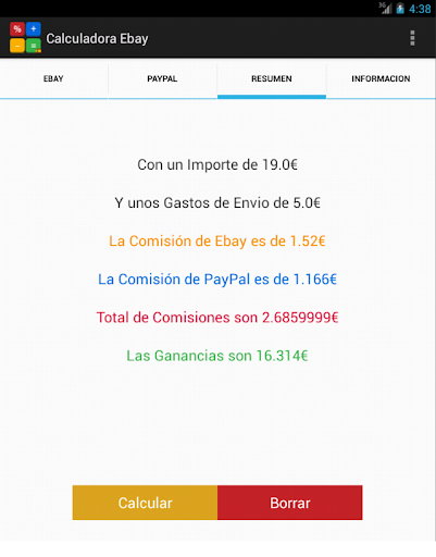 ![]() Hay algunas versiones de calculadora ebay pero la gran mayoria estan configuradas con ebay UK y queria una para ebay España. Bueno, lo primero decir que el objetivo de la aplicacion era aprender a hacer una App en Android y depaso tener una aplicacion que me calculara las comisiones de ebay y paypal para publicar anuncios y no estar multiplicando cada vez por tres para obtener el beneficio y cuanto perdería en comisiones si lo vendiera a tal precio y tal... En futuro me gustaría mejorarla y que mejor manera de hacerlo que conociendo sus puntos débiles que seguro que encontrareis , pero aún así estoy satisfecho del resultado sin tener ni idea de nada.Saludos CALCULADORA EBAY Descripción Con esta aplicación podrás calcular las comisiones de venta de tus productos en Ebay, así como, las comisiones por recibir pagos a través de PayPal. Una misma aplicación que integra ambas funciones y que puede ser utilizada para calcular las comisiones por separado o para una misma venta. Es importante leer el apartado de información para saber como funciona la aplicación. Hay dos formas de utilizar esta aplicación y que se explican detalladamente a continuación: a) Se puede utilizar para calcular las comisiones de Ebay por venta realizada, ya sea en formato subasta o de compra, obteniendo la comisión a pagar a Ebay y la diferencia obtenida por el importe introducido. Y también se pueden obtener las comisiones de PayPal por pagos recibidos y la diferencia respecto al importe introducido. Todo ello se realiza por separado en cada sección. b) Y si se quiere obtener las comisiones de Ebay y PayPal para una misma venta se ha de seguir los pasos que se indican en la sección información de la aplicación, y que se detallan a continuación: 1) Introducir en la sección Ebay un importe de venta final y calcular. 2) Introducir en la sección PayPal el importe total, es decir, el importe de venta final más los gastos de envío. 3) Entrar en la sección Resumen y pulsar el botón Calcular para obtener las comisiones de Ebay y PayPal desglosadas para esa venta, así como las comisiones totales y ganancias obtenidas por la venta. Esta aplicación se basa en la información aportada por Ebay España y PayPal España. Podeis probarla desde aqui |