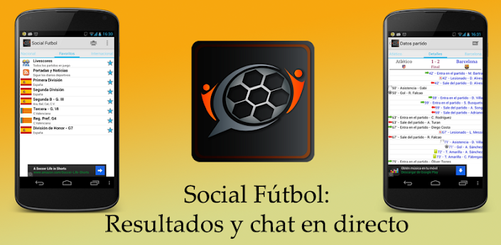 Os traigo mi último desarrollo para Android: SOCIAL FUTBOL - LINK PARA DESCARGA Twitter oficial Web oficial Página en Facebook Social Fútbol es una nueva app para dispositivos móviles Android que te permite seguir en directo las principales ligas, tanto de España como internacionales, con el añadido de tener un elevado componente social. Social Fútbol lleva integrados chats para cada partido así como un foro por cada liga donde poder compartir nuestras impresiones con el resto de usuarios. Es especialmente útil para seguir con detenimiento los partidos en todas las categorías del fútbol español, dado que la base de datos permite consultar desde la Primera División hasta partidos de regional y juveniles, además de competiciones internacionales y ligas extranjeras pudiendo marcarlos como favoritos permitiéndote tener tus competiciones preferidas al alcance de la mano con solo un click. La aplicación nos permite seguir en todo momento, al detalle y completamente en vivo, el desarrollo de los partidos (alineación, goles, asistencias, lesiones, cambios, árbitro, estadio, etc), e incluso consultar en qué canal de televisión se retransmite el partido y vídeos relacionados con el partido en cuestión. Destacar el ya mencionado plano social de la aplicación, pues permite chatear con otros usuarios tanto sobre como va el partido como sobre la liga en general. Como valor añadido, se incluye también actualizado de forma diaria todas las portadas de los principales diarios deportivos, pudiendo acceder también a las noticias publicadas SOCIAL FUTBOL es un referente en aplicaciones futboleras para móviles, creando en una sola aplicación el contexto futbolístico que necesitas: las principales noticias diarias, la alineación de tu equipo, la fecha del partido, consultar el desarrollo del partido, saber en qué TV darán el partido y poder chatear a la vez con más usuarios, pudiendo seguir los partidos de todas las categorías del fútbol español y de las principales ligas extranjeras! La aplicación es gratuíta y podéis desacargarosla desde google play o desde el link: SOCIAL FUTBOL - LINK PARA DESCARGA Twitter oficial Web oficial Página en Facebook