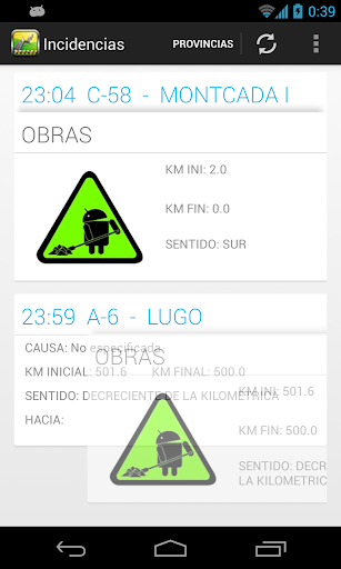 Vengo a presentaros mi primera aplicación, llamada Incidencias Como su propio nombre indica, sirve para conocer las Incidencias de tráfico en las carreteras de España Todas las aplicaciones que había probado, o tenían una interfaz muy arcaica, o mostraban incidencias de dias anteriores, o cargadas de publicidad... Así que si quieres algo bien hecho, hazlo tu mismo Así que me puse a ver qué características quería que tuviera mi aplicación ideal, y me puse a ello Al principio era muy básica, pero conforme fui entrando en el mundo de la usabilidad y la estética, me pregunté si quizá a alguien más le gustaría usarla, y tras los procesos de beta-testing y ver que tenía buena acogida, me planteé publicarla, y hoy vengo a traeros el resultado Tiene una interfaz basada en tarjetas (CARDS UI), igual que la aplicación Google Now, lo cual le confiere una interfaz fácilmente usable y muy visual, que es lo que me interesaba. Primero se nos muestra una tarjeta general con la hora y la carretera, un icono indicando la causa y la gravedad de la incidencia, el kilometro inicial, el final, y el sentido. El icono muestra: