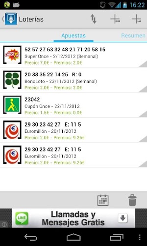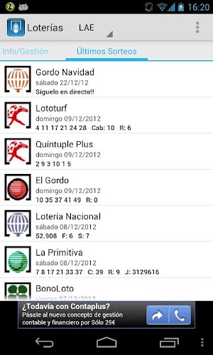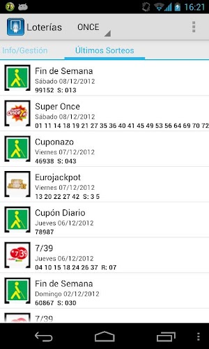 Os presento un app para la consulta de los resultados de Loterías y Apuestas del Estado: Link de descarga: Loterías ----------------------------------------------------------------------------------------------- v2.0 Notificaciones v1.16 Añadido comprobador de décimos de la Lotería de Navidad v1.15 Integrado el Gordo de Navidad para seguimiento en directo v1.14 Comprueba varias apuestas simultaneas v1.12 Posibilidad de comprobar automaticamente el Cupon, Super Once, Eurojackpot y 7/39 v1.11 Posibilidad de añadir el Cupon, Eurojackpot, SuperOnce y 7/39 a la gestión de apuestas. v1.1 Sorteos ONCE añadidos ----------------------------------------------------------------------------------------------- Como sabréis hay muchas apps sobre esta temática en la Play Store, pero esta es la primera y la única que permite llevar una completa gestión del histórico de las apuestas realizadas y los premios recibidos, para llevar cierto control sobre lo que ganamos o perdemos. Incluye todos los juegos de Loterías y Apuestas del estado y de la ONCE. Además contiene secciones especiales para el sorteo de Lotería de Navidad y del Niño Destacar que se han seguido los criterios de diseño Pure Android establecidos por Google para el desarrollo de apps Android. Tiene estética holo muy intuitiva y funcional Nada más abrir la aplicación ya carga de forma automática los resultados de los juegos de los últimos 7 días, para acceder a la última información de forma sencilla, rápida y cómoda (podemos elegir entre LAE y ONCE): Pinchando en cualquier juego accederemos a los resultados completos y reparto de premios: Destaca la posibilidad de moverse a los sorteos anteriores y posteriores con las flechas disponibles en la barra inferior A la parte derecha en la pantalla principal se incluye un menú para acceder a la búsqueda de cualquier sorteo de cualquier según la fecha. Además se incluye el acceso al menú de gestión de apuestas: En el menú apuestas podemos añadir nuestras jugadas, pudiendo elegir los números de forma aleatoria o manualmente y se puede añadir información sobre la fecha en la que se realiza dicho sorteo, si se trata de una apuesta semanal o no (para Bonoloto, Primitiva y Euromillón) y el precio y premio obtenido en la apuesta. En la siguiente imagen se puede ver dicha pantalla una vez añadidas varias apuestas: A destacar lo siguiente: -Es posible repetir una misma apuesta indicando únicamente la nueva fecha -Se puede realizar comprobación de premios pulsando un solo botón (de momento en fase Beta, pero ya está activo para todos los sorteos) -Posibilidad de archivar las apuestas antiguas (pasan a la pantalla de apuestas antiguas de este mismo menú) Y por último, en la pestaña resumen podemos acceder al resumen del total gastado y los premios obtenidos, separados por tipo de juego y en agregado: Respecto a los sorteos especiales, se va a hacer seguimiento en directo de ellos. Por ejmplo, para el Gordo de Navidad en tiempo real si han salido ya los números correspondientes a los premios más importantes, además hay integrado un comprobador de décimos: En esta pestaña se añadirán en breve estadísticas por juegos, mensuales, anuales y otras novedades. Además está previsto añadir gradualmente ciertas mejoras que ya os iré mostrando Cualquier idea, sugerencia o crítica es bienvenida
