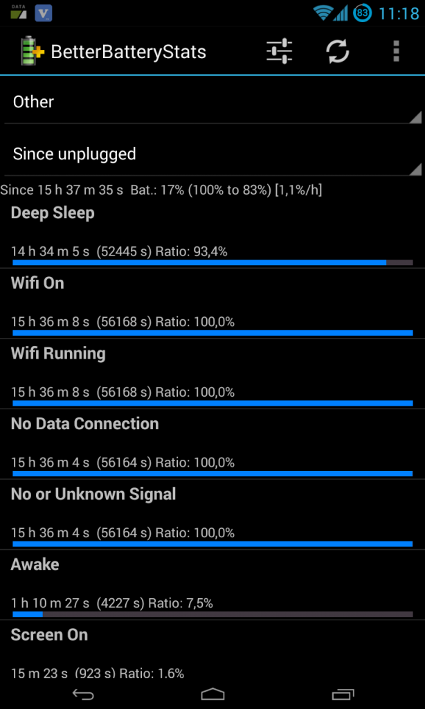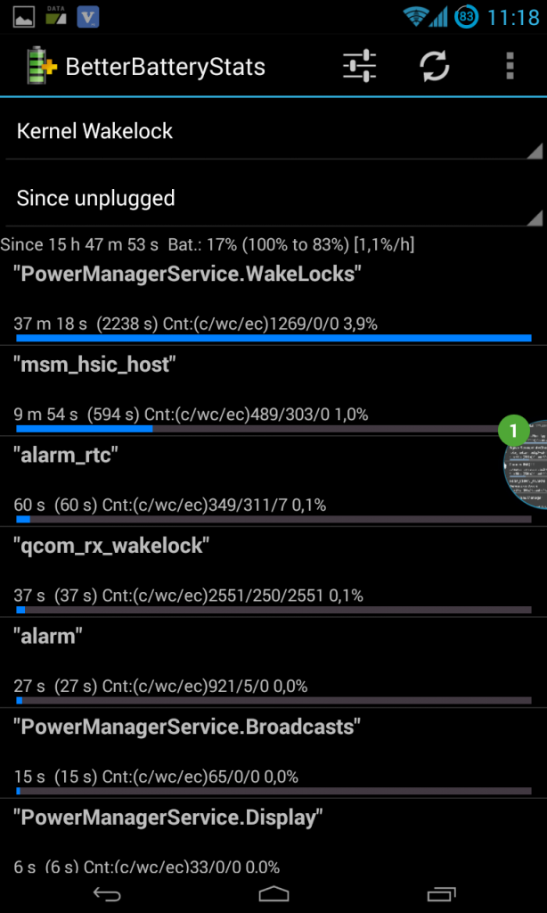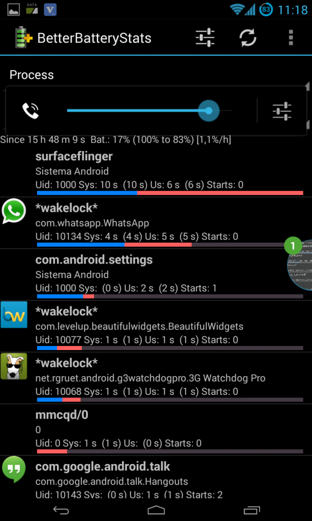 Esta version me esta tocan la moral.. Despues de varios dias probando el kernel B35 me sigue haciendo cosas raras con la bateria pero no creo que sea por el kernel. Me baja de media 7-8% en reposo estando en IDLE solo con wifi ON con cualquier rom o kernel que pruebe.Bueno creo recordar que con la que terminaba en Y (la oficial me parece) no me pasaba. No se si sera por los wakeloks pero me tiene harto y menos mal que la 4.4 esta cerca a ver si lo solucionan. Por ej ayer cargo a tope el movil con la B35 (rom eclipse), me aguanta unas 3 horas a tope y me piro a ver la TV estando al 99%, cuando vuelvo a la hora y media veo que esta al 93% cosa que no entiendo. Me acuesto y me levanto con la bateria al 84% despues de 7 h? esto no pasaba con la 4.2.2.. vaya mierda veo varios wakelocks pero no se si es por eso o es alguna aplicacion interna de sistema que no aparezca en las estadisticas.Tengo que decir que no he hecho instalacion limpia , siempre restauro las apps con la rom que ponga ya que me puedo morir si tengo que ir de una en una... He probado de todo, limpiadores de kernel,wipes y na ![]() ![]() ![]() ![]() salu2 |