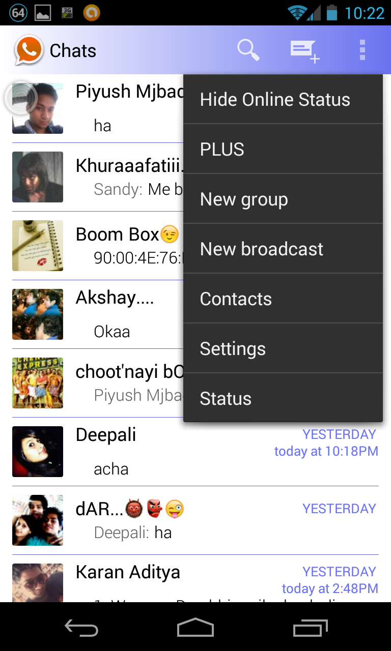 - damos al boton donde nos aparezca el menu principal (con ajustes,nuevo chat,nuevo grupo,etc)como vereis os aparecera en mayusculas una opcion que se llama "PLUS" esa la opcion a que entremos continuamente para epersonalizar el whatssap+