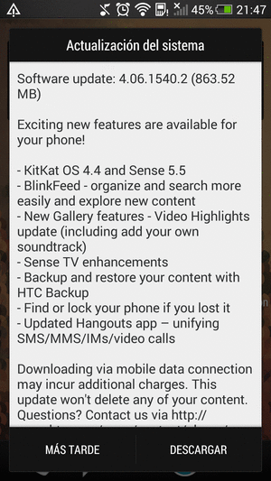 Acabo de regresar del trabajo lo primero que hize fue desbloquear mi one para jugar MD4 y valla sorpresa veo en la barra de notificaciones "existe una actualización de sistema presione para descargar" lo presionó y valla sorpresa... Android Kik Kat y sense 5.5 para mi hermoso one .... Alguien ya lo descargo??