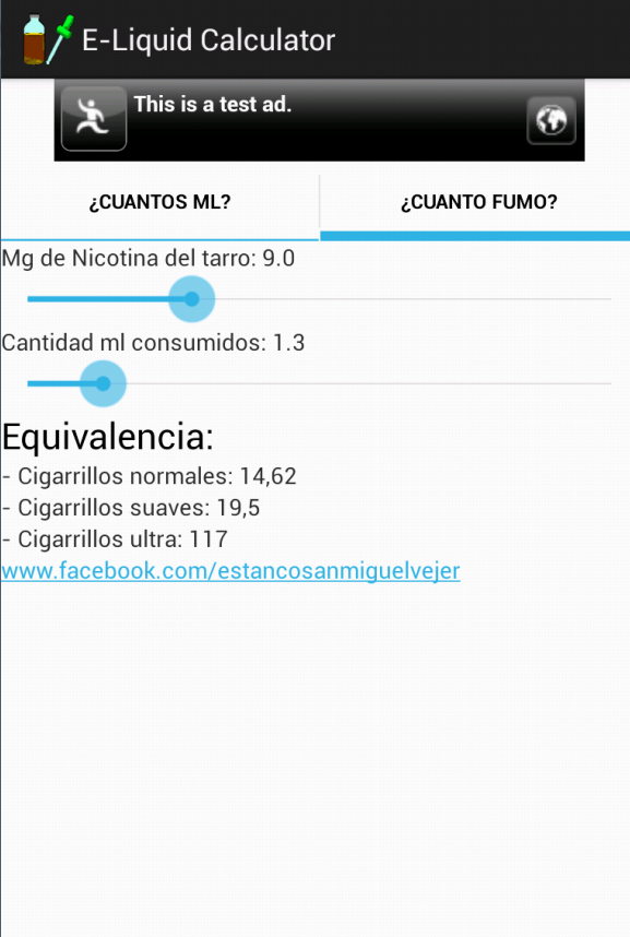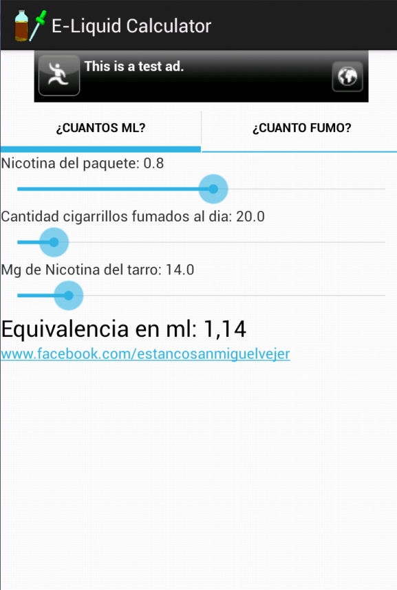 Últimamente está floreciendo una nueva moda "vapear" y que si cigarrillo electrónico por aquí y por allá. Me he dado cuenta que hay poquísima información de la cantidad de nicotina que está consumiendo la gente. Por ese motivo he hecho esta aplicación que espero que le sirva de ayuda a mucha gente. La primera parte de la aplicación se basa en el cálculo de la cantidad de líquido que se debe de consumir como mucho dependiendo de la marca a la que se esté acostumbrado. Para ello hay que indicar la cantidad de nicotina que tiene la marca a la que se está habituado, la cantidad de cigarrillos que se consumen al día, y la concentración de nicotina que tiene el liquido que nos han vendido. Esto nos calcula la dosis diaria de liquido a consumir. La segunda parte es el cálculo inverso al anterior. Partiendo de la concentración y de la cantidad consumida, nos calcula a cuantos cigarrillos equivalen. Aqui os dejo imágenes: