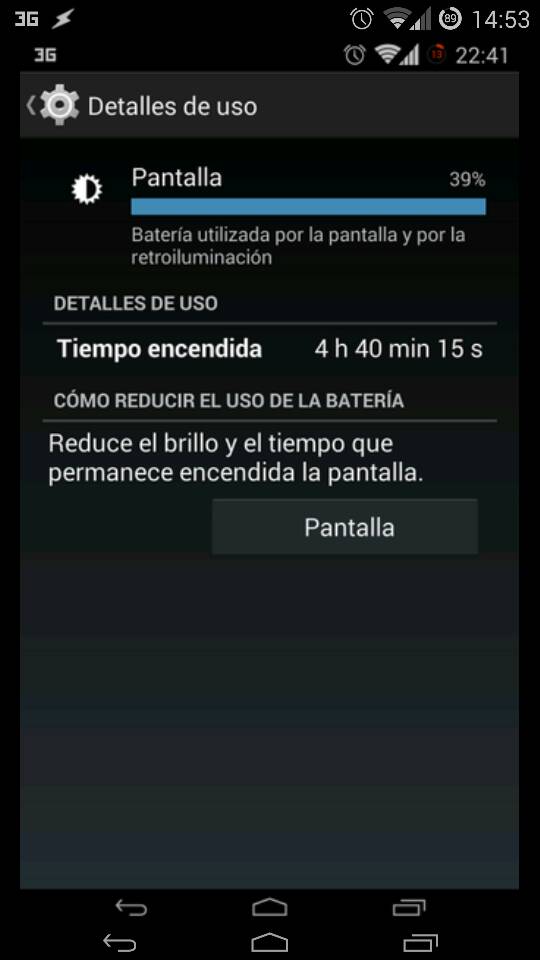 BATERIA,lo pongo en neutral porque depende de cada uno perp me ha dejado MUY FRIO el hecho que el amigo, me lo haya dejado probar dos veces, y las dos lo tenia alrededor del 50% con tan solo 1h y 15 minutos o algo asi de pantalla (eso si. Brillo al 100% y Google Now acticado) pero no quiero tener que desactivar medio telefono para que me llegue vivo por la noche, en el foro del nexus, he leido medio post de "postea tu bateria" y como en todas partes, hay gente con 3 horas de pantalla (lo que me parece MUY justito) 4 horas y algo, incluso he visto 5h 30 o mas.
