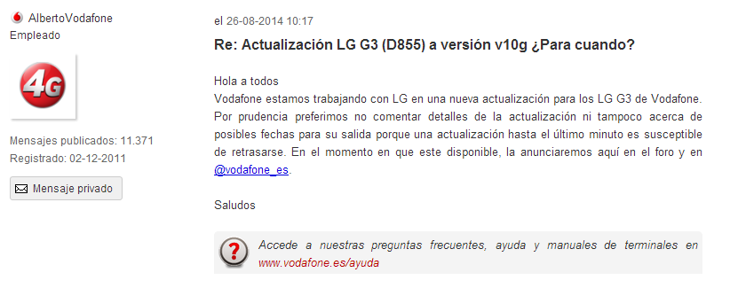 Vamos típica frase para escurrir el bulto... XD Un mensaje atrás dice que es LG quien las hace con las exigencias de Vodafone, luego los de Vodafone los testean y si está todo OK la lanzan... Ahora dice que están trabajando con ellos, pero no pueden decir tiempo ni nada... JA JA JA