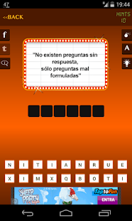 Frases de Cine Quiz es un juego que consta de 5 niveles con 10 frases en cada nivel, y en el que tendrás que acertar 5 frases como mínimo para pasar al siguiente nivel. En cada frase tienes pistas que te ayudarán a descubrir una letra de la frase de cine o eliminar las letras que no te sirven, así como dos pistas de información relacionadas con la película a la que pertenece la frase. También puedes preguntarle a tus amigos de Facebook y twitter para que te ayuden a resolver todas las frases.