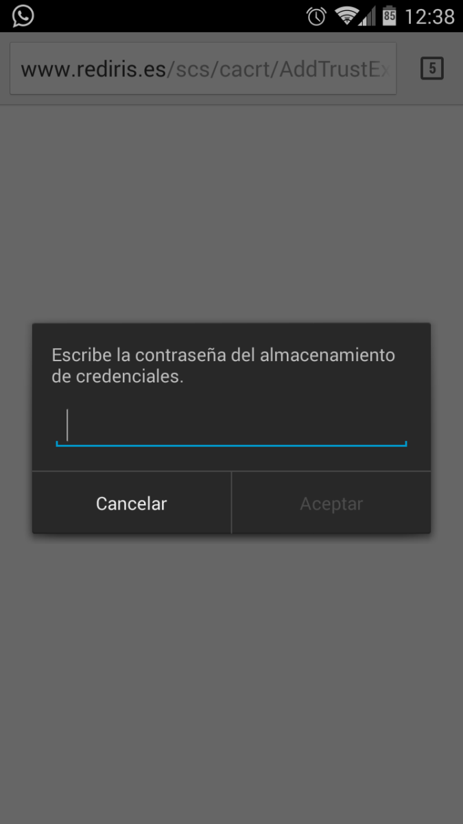 Eso me paso ayer con unas credenciales que tenia instalado en el movil. Cuando instalas las primeras credenciales en el telefono te obliga a bloquearlo de alguna forma, patron, pin u otra cosa, yo lo tenia asi y una app que me descargue de la play store me quito el obligado bloqueo android (era una app de screen lock). Lo arregle desinstalando esa app, borrando el almacen de credenciales y activando el bloqueo de pantalla con un patron, volvi a instalar las credenciales y sin problemas. |