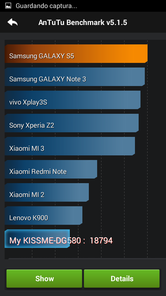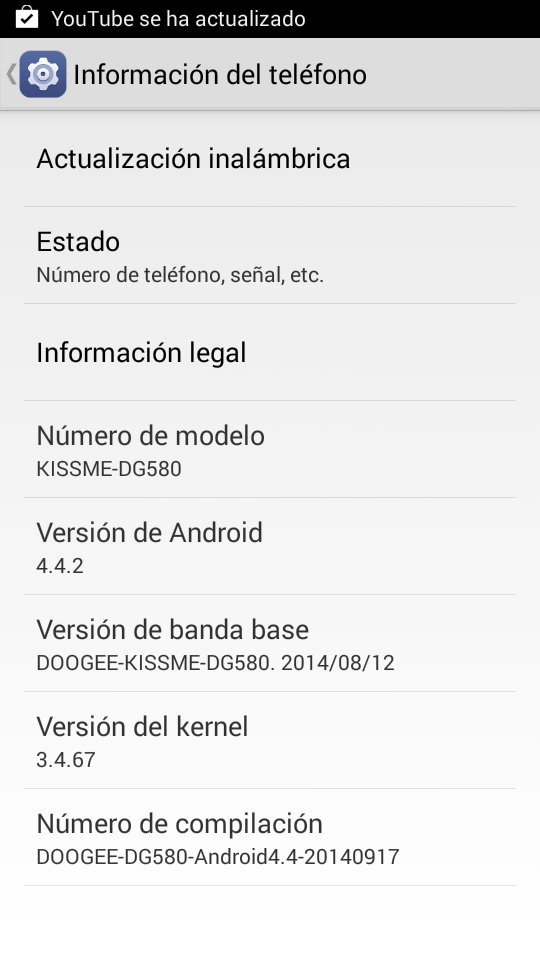 http://www.banggood.com/es/DOOGEE-KI...-p-942573.html También he conseguido un código de descuento de 5 dólares, válido hasta el 15 de noviembre bdg580 El envío como siempre perfecto, unos 20 días, con número de seguimiento y muy bien embalado por si se lleva algún golpe por el camino. El DG580 viene en una caja de cartón reciclado, muy parecida a todas las que envían las marcas chinas últimamente. Como ya he comentado el diseño es muy parecido al del OnePlus, me gusta sobre todo que tiene bordes finos y pese a ser un terminal de 5,5 pulgadas no pesa mucho. El material en el que está construido es plástico, pero da la sensación de robustez y de aguantar bien el paso del tiempo. ![]() Dentro de la caja encontramos el smartphone, un cargador europeo, auriculares y cable USB. Y algo que me ha gustado mucho y que más compañías deberían imitar, el DOOGEE viene con un protector de pantalla ya puesto, por lo que no tiene burbujas de aire ni nada por el estilo. Todos sabemos que poner el protector nunca ha sido fácil y pocas veces sale a la primera. Pero eso no es todo, además del que lleva en la caja encontramos otro de repuesto, por si algún día lo necesitamos. En cuanto a autonomía el DG580 lleva una batería de 2500 mAh, nos dará de sobra para aguantar todo el día sin muchos problemas. ![]() A continuación os dejo algunas de sus principales características: Bandas: 2G: GSM 850/900/1800/1900MHz 3G: WCDMA 850/1900/2100MHz Dual SIM Android 4.4 Procesador: MTK6582 1.3GHz Quad core ROM: 8GB RAM: 1GB Pantalla QHD IPS OGS de 5,5 pulgadas Cámara frontal: 8 MP Cámara trasera: 8 MP con un ángulo de 88º Bluetooth 4.0 Ranura para tarjetas Micro SD ![]() Gracias al giga de RAM y al procesaror Quad Core el DG580 mueve Android 4.4 de forma muy fluida, no notaremos nada de lag en las transiciones o a la hora de abrir aplicaciones. Incluso podremos jugar a los juegos más potentes de la Play Store sin problemas. Algo muy interesante de este Doogee son los gestos, en las opciones generales encontramos una opción que nos permite realizar diferentes acciones mediante gestos en la pantalla, como por ejemplo seleccionar la cámara de fotos, lanzar apps, girar el teléfono para descargar una llamada... Por ejemplo, si dibujamos una "C" en la pantalla automáticamente aparecerá la cámara para poder hacer fotografías sin perder un segundo. En la siguiente imagen tenéis algunos ejemplos, estas opciones son totalmente configurables a nuestro gusto. ![]() El DOOGEE KISSME DG580 viene completamente en español y con la Play Store instalada, por lo que podremos instalar apps nada más encenderlo. ![]() Toca hablar de la cámara, a pesar de no ser el punto fuerte de este smartphone las fotos no están nada mal, la calidad es parecida a la de todos los terminales de gama media, fotos bastante decentes con luz, y un poco deficientes de noche cuando tenemos que tirar de flash. Aquí os dejo algunas que hecho de prueba. ![]() ![]() ![]() También os dejo a continuación el resultado del test de Antutu y una comprobación de que el GPS funciona perfectamente. ![]()